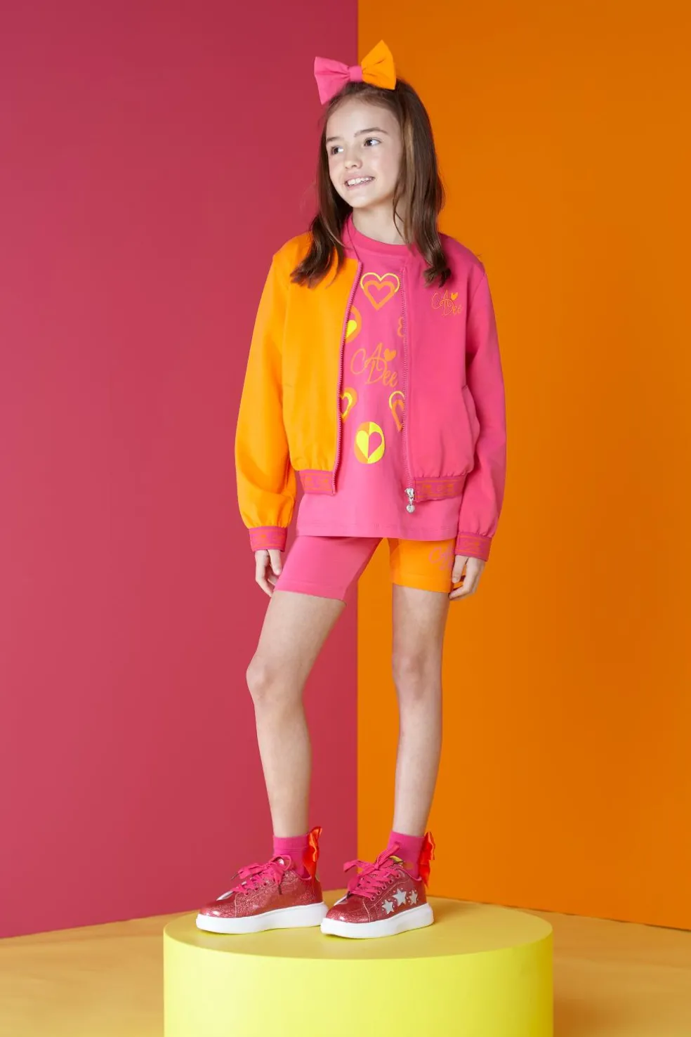Colour block sweat bomber with embroidered logo on front. Elasticated cuffs and waistband with contrast logo finished with large colour block heart artwork on back.