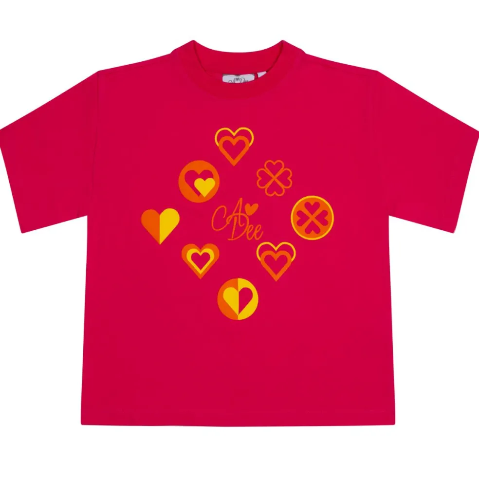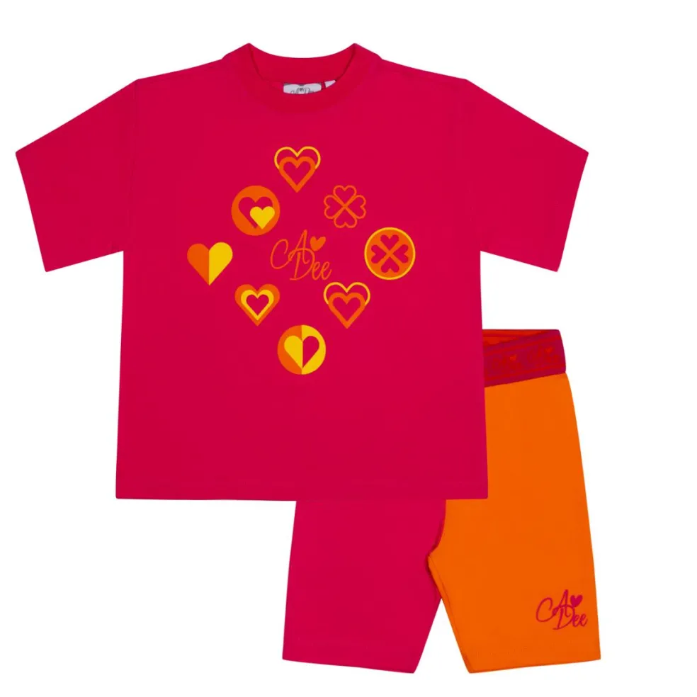 2 piece colour block cycling short set with oversized t shirt with printed heart and logo artwork on front of top paired with colour block cycling short featuring elasticated logo waistband finished with printed logo.