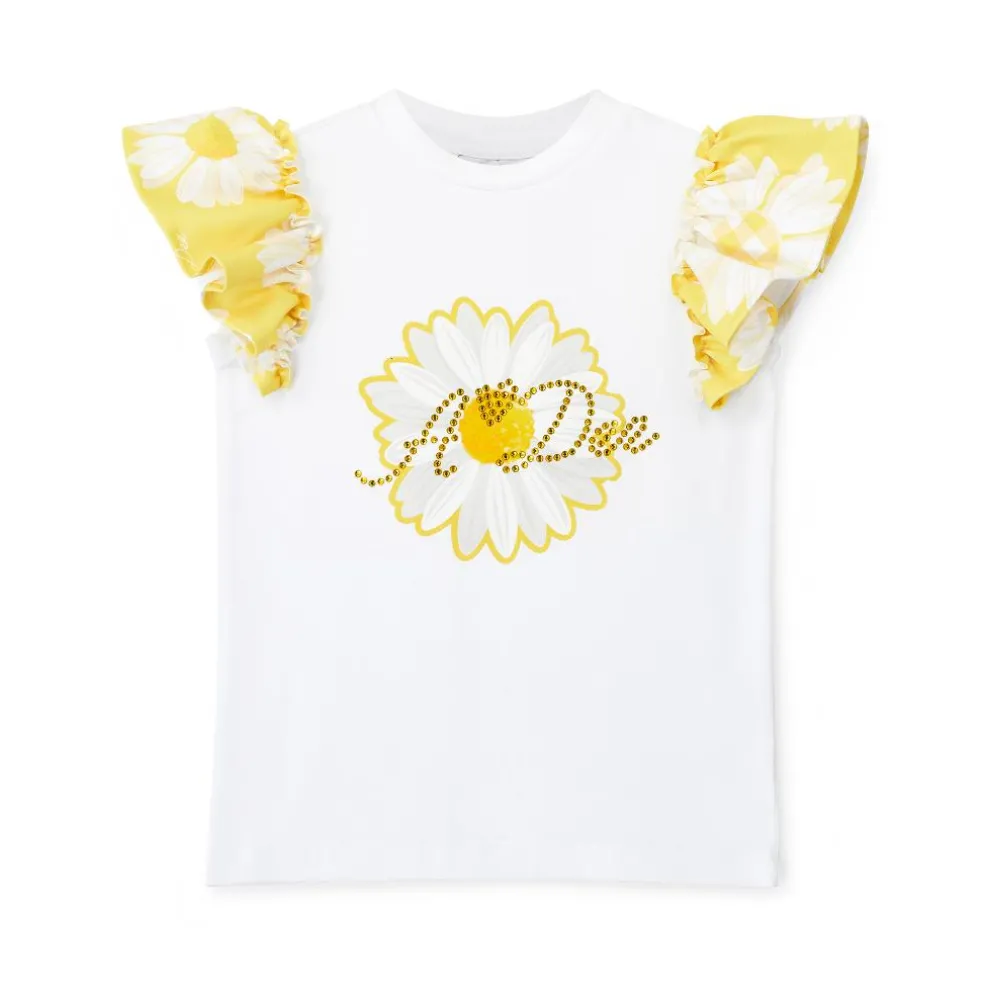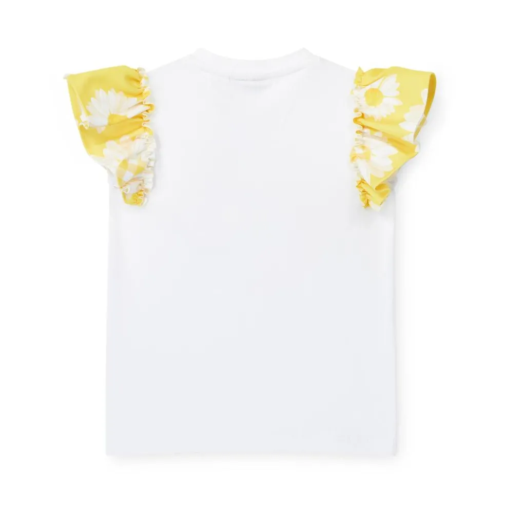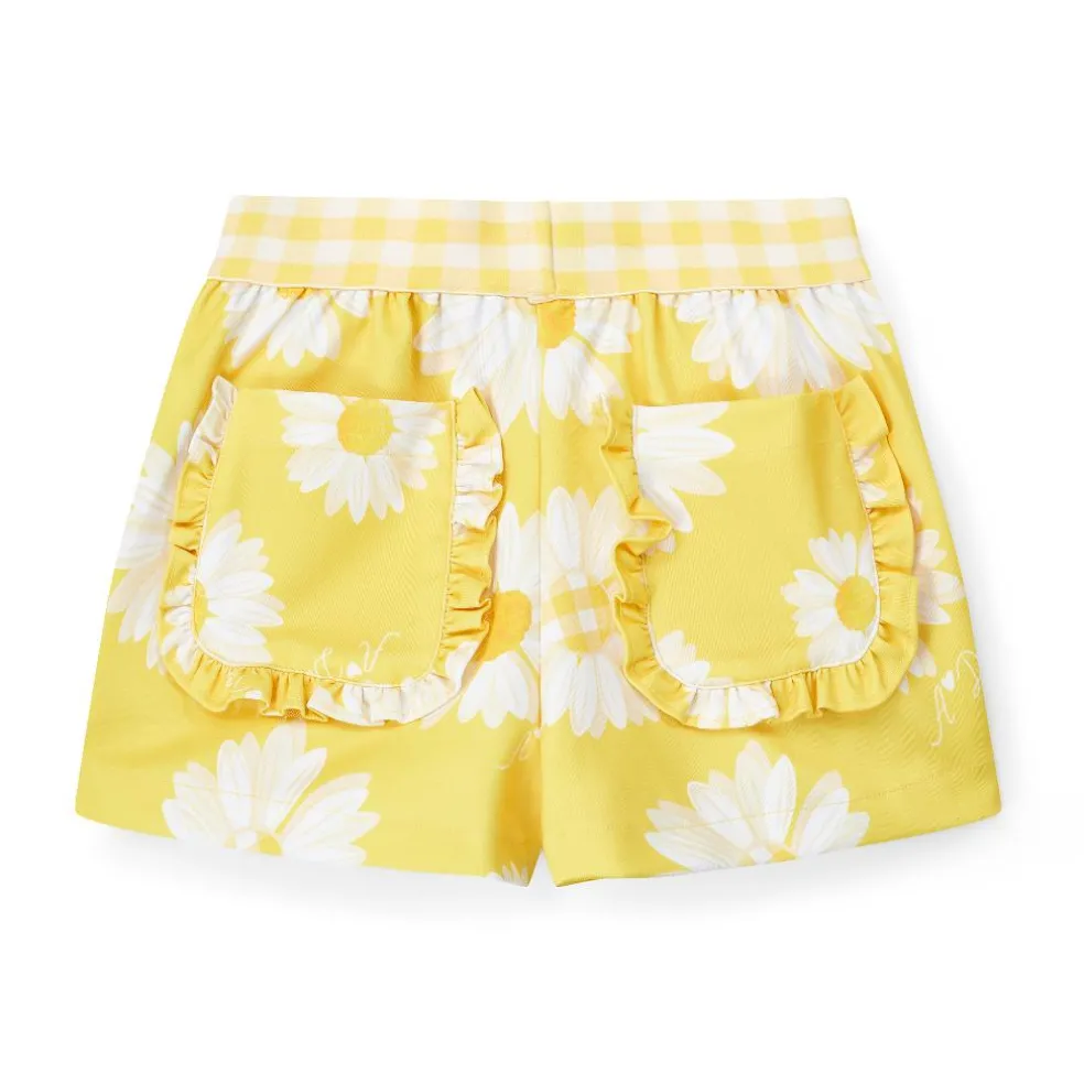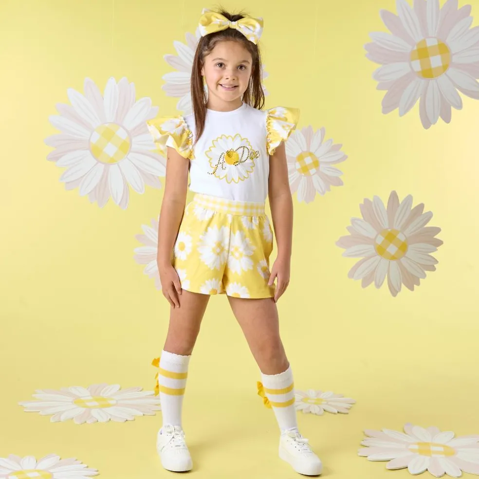 This two piece Dorothea set comes complete with white jersey top featuring pretty yellow daisy print frilled sleeves and artwork on the front. The matching daisy print shorts have a check elasticated waistband and frilled back pockets.