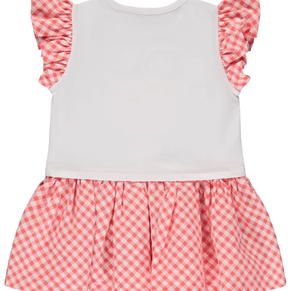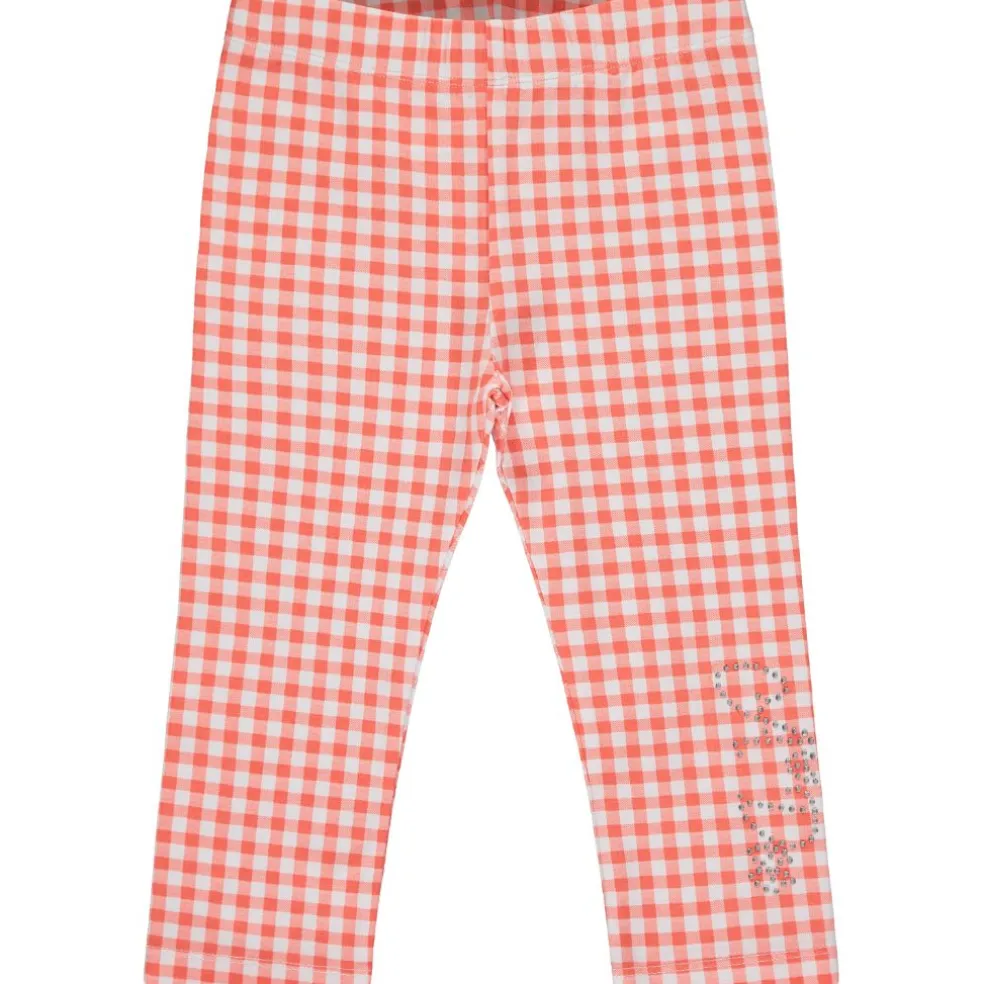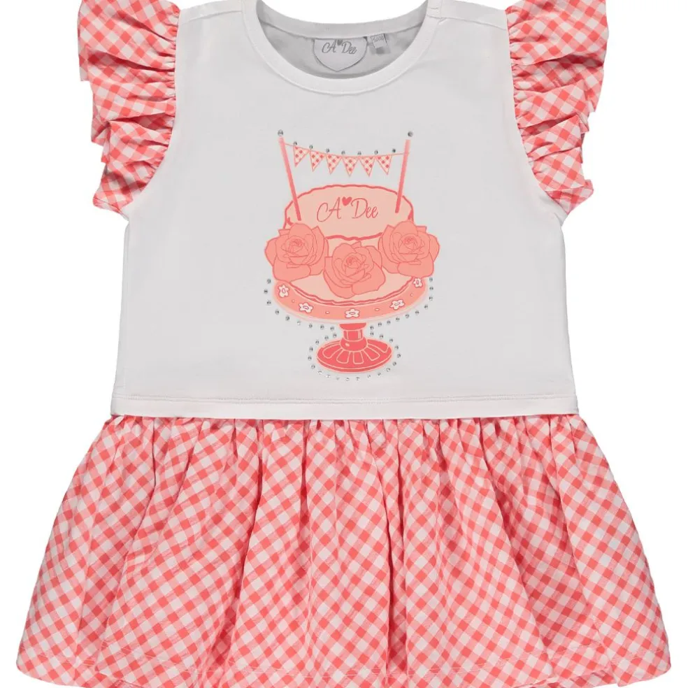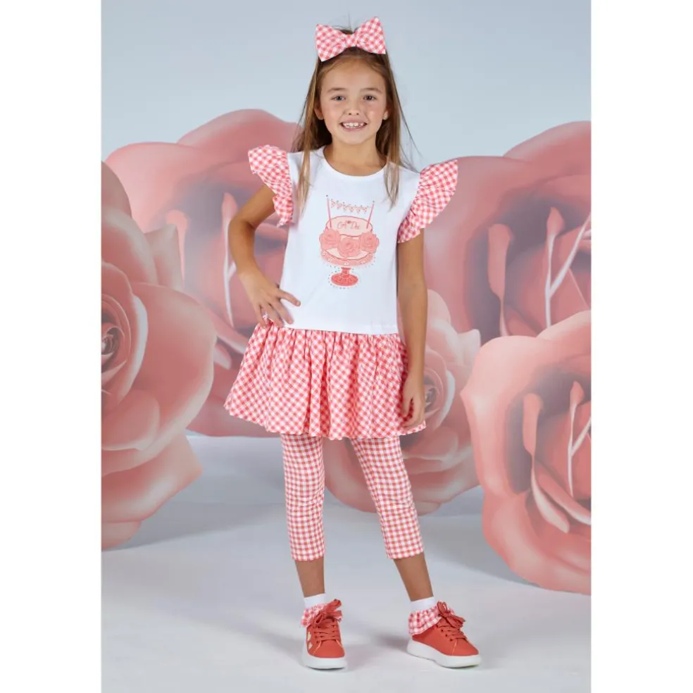 2 piece legging set with tunic top featuring contrast check peplum frill and sleeves with printed and diamante cake party artwork on front with matching check leggings finished with diamante A*Dee logo on leg.