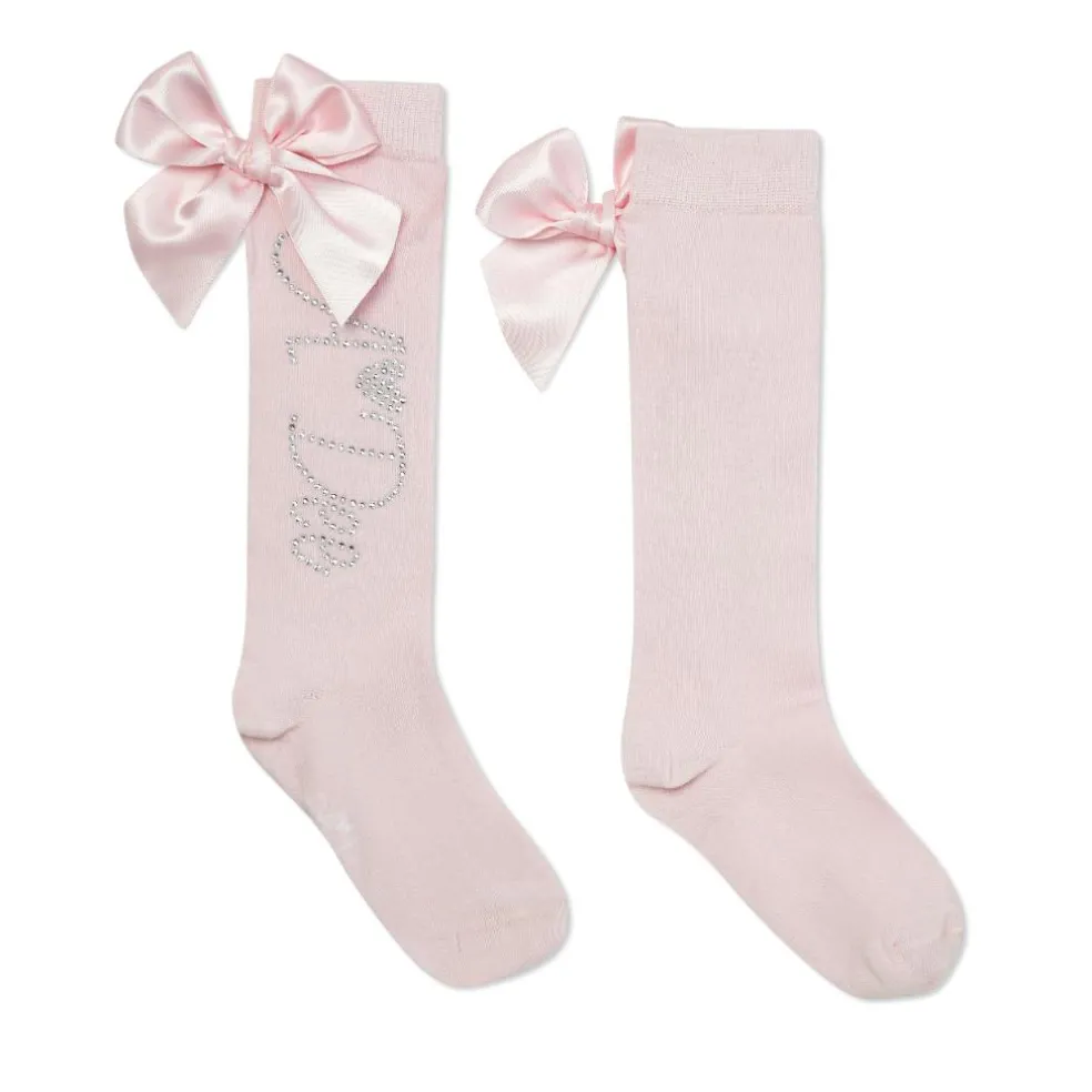 Match any outfit in the Heavenly Hydrangea collection with these Charleigh high knee socks, featuring a diamante logo on each side and beautiful pink satin bows.