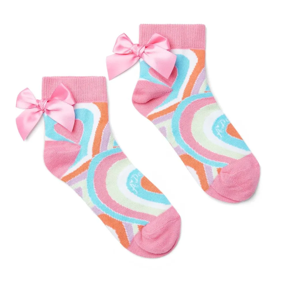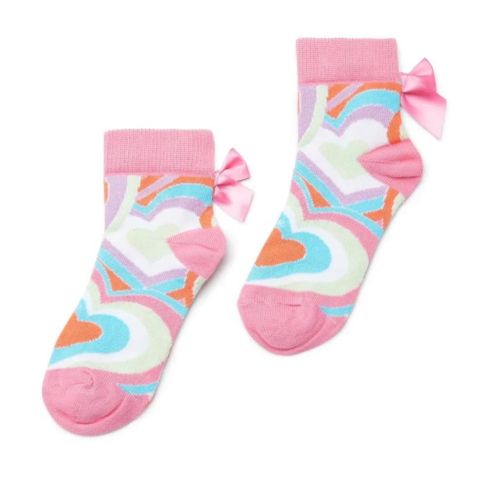 These Evie ankle socks are the perfect addition to any outfit in the Pop Hearts collection, made in the allover heart print with pink satin bows.