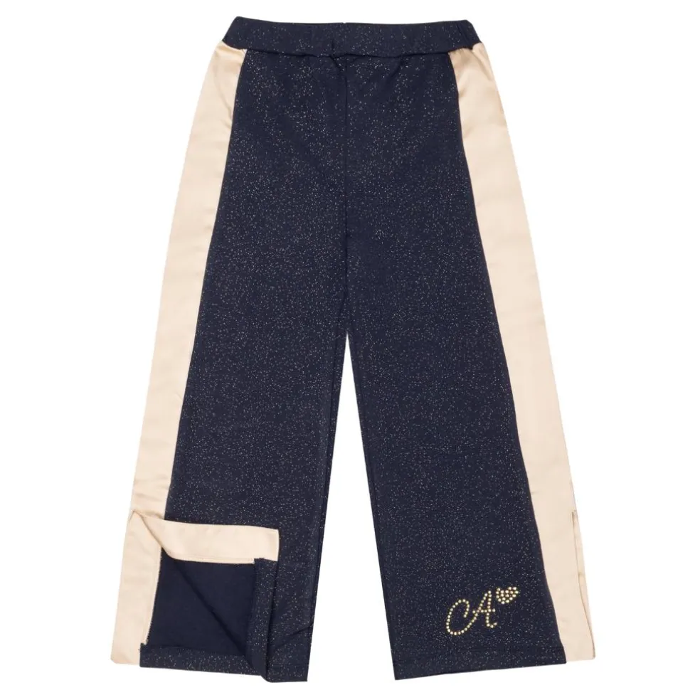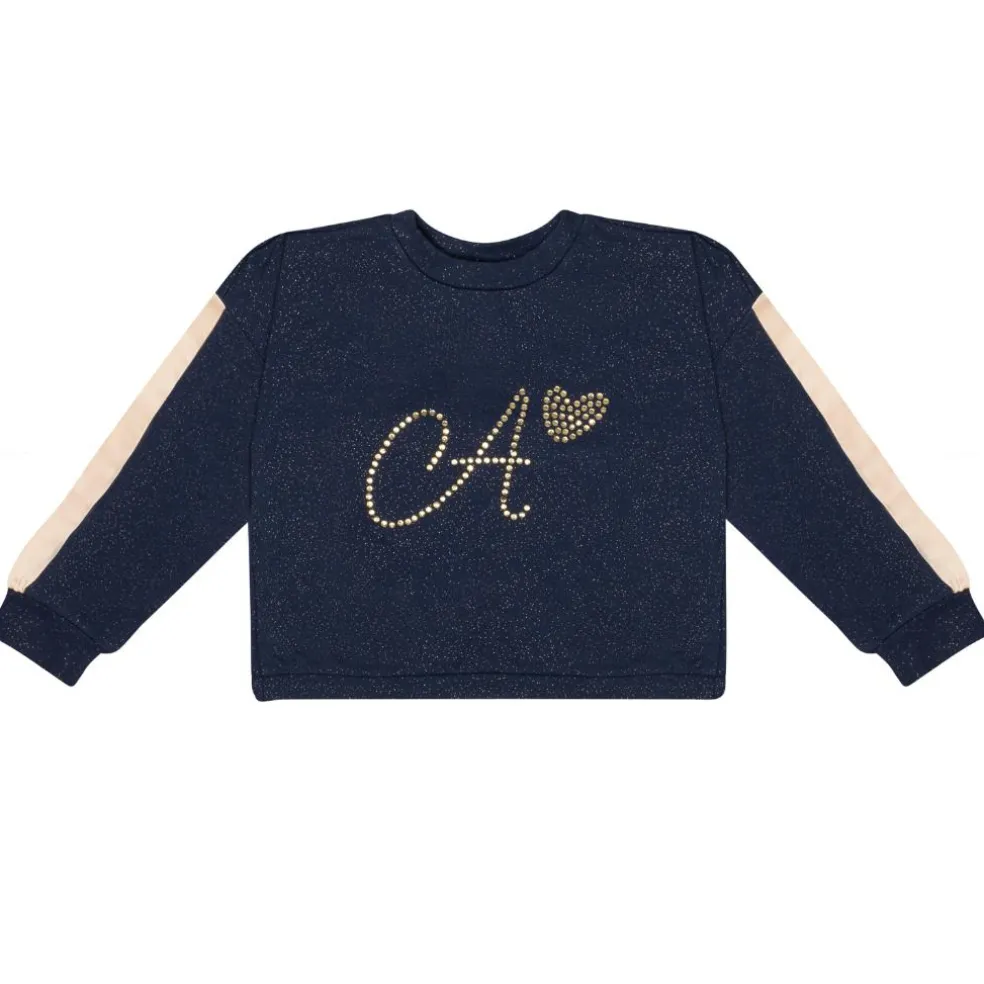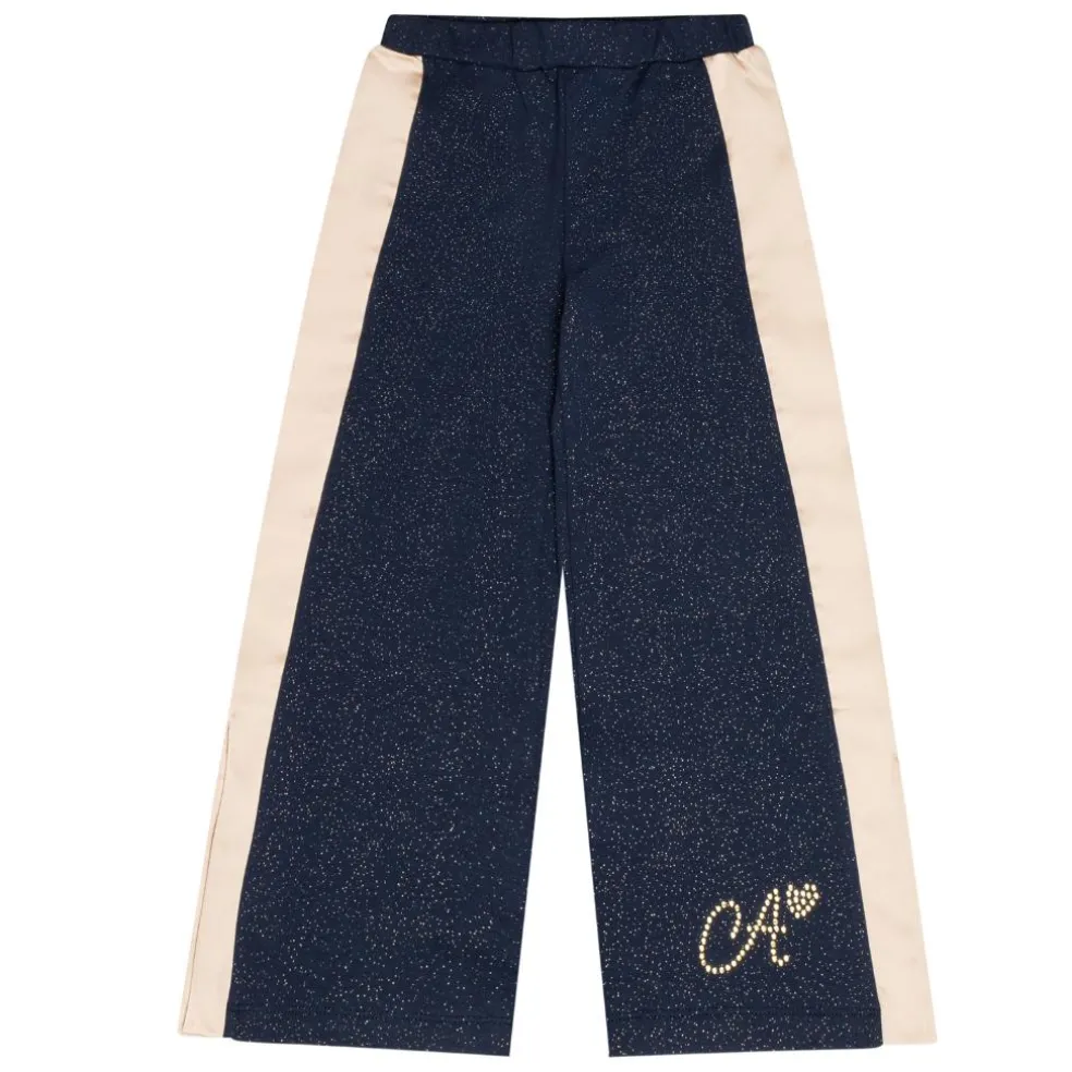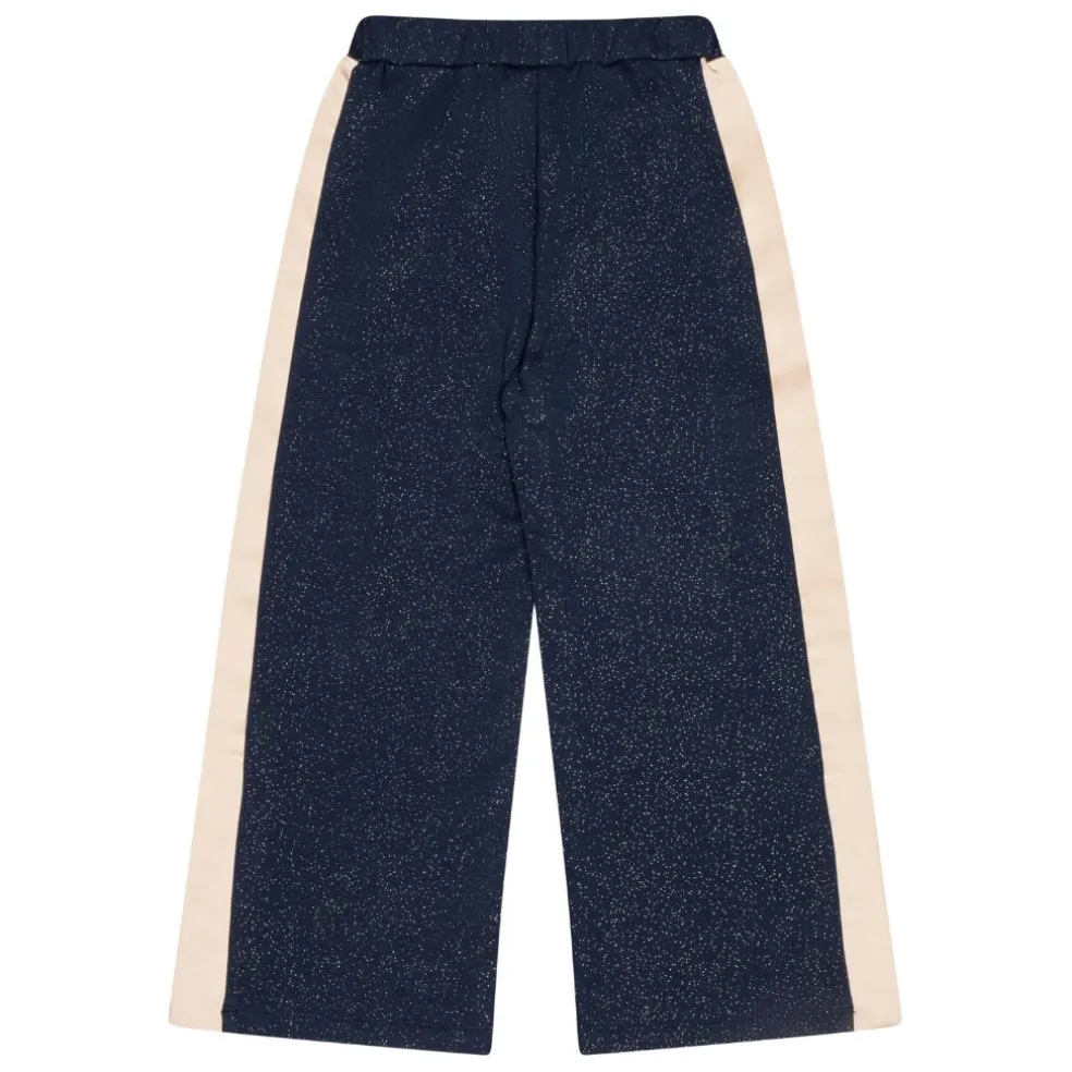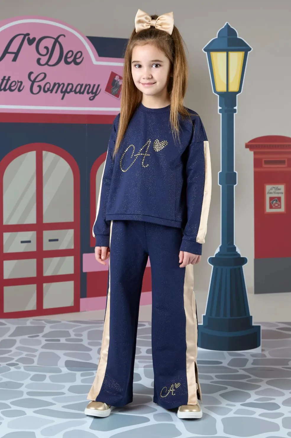 Glitter sweat tracksuit featuring jumper with large gold satin bow on back and diamante branding on front matched with flare joggers hosting gold satin side inserts finished with split hem at bottom.