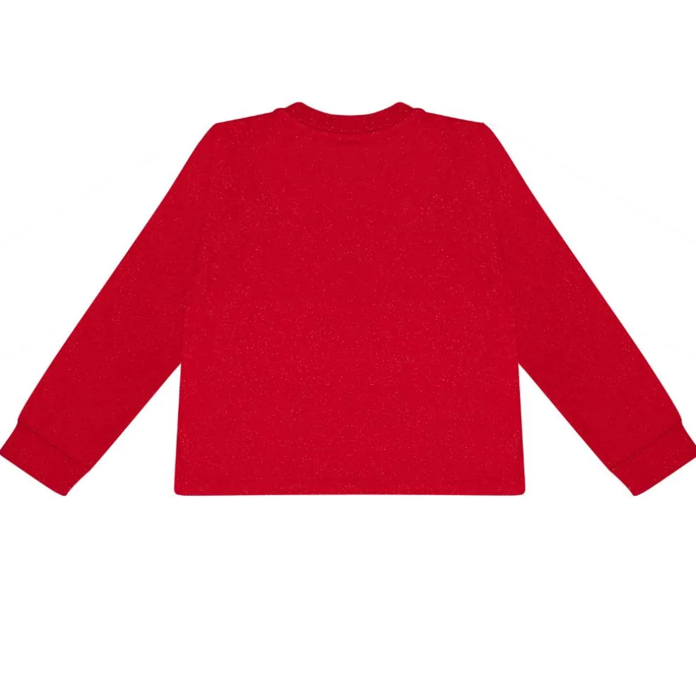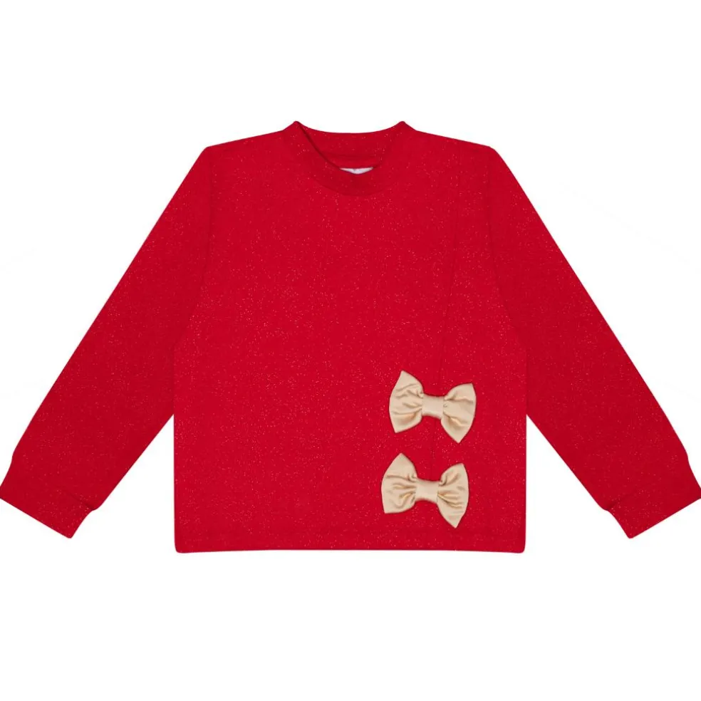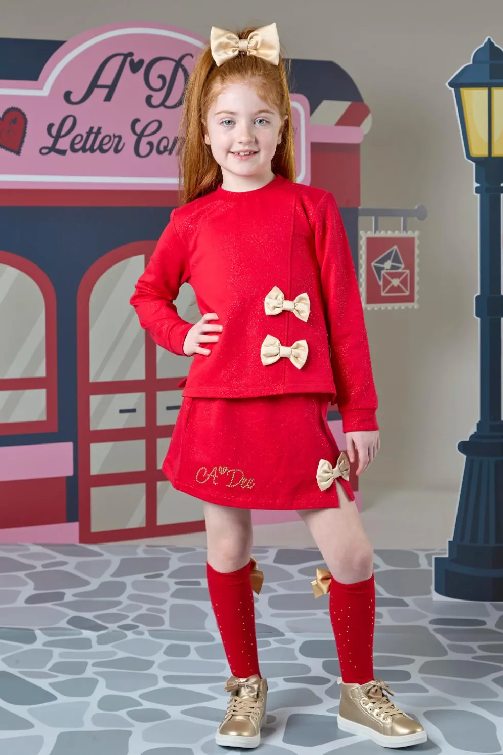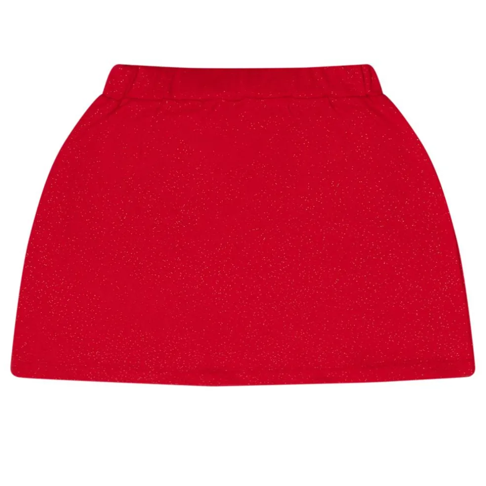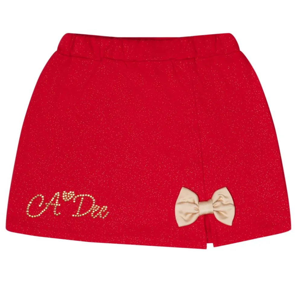 Glitter sweat skirt A-line skirt with gold bow and gold stoned branded artwork on front, paired with matching glitter A-line sweat top featuring gold bows.