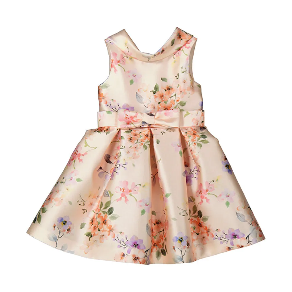Beautiful fully lined sleeveless dress in a delicate pink floral print with a lovely folded neckline which finishes with a “v” at the back. The dress is finished with a sash belt which has an appliqued bow at the front.