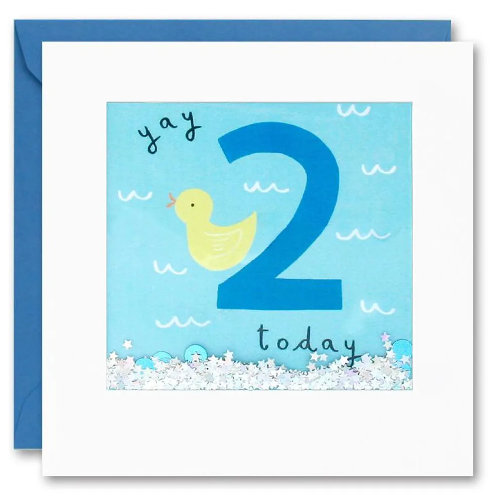 A colourful age 2 card illustrated by Katherine Hartley. The image on the front shows a yellow duck, next to the number 2 on a blue background.