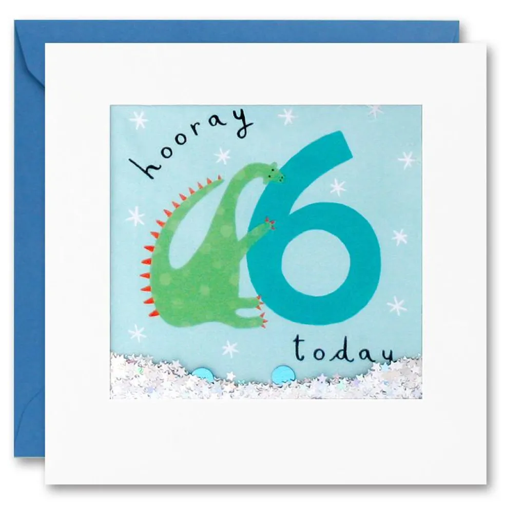 The text on the front reads ‘hooray 6 today’. The card is blank inside for your own message.