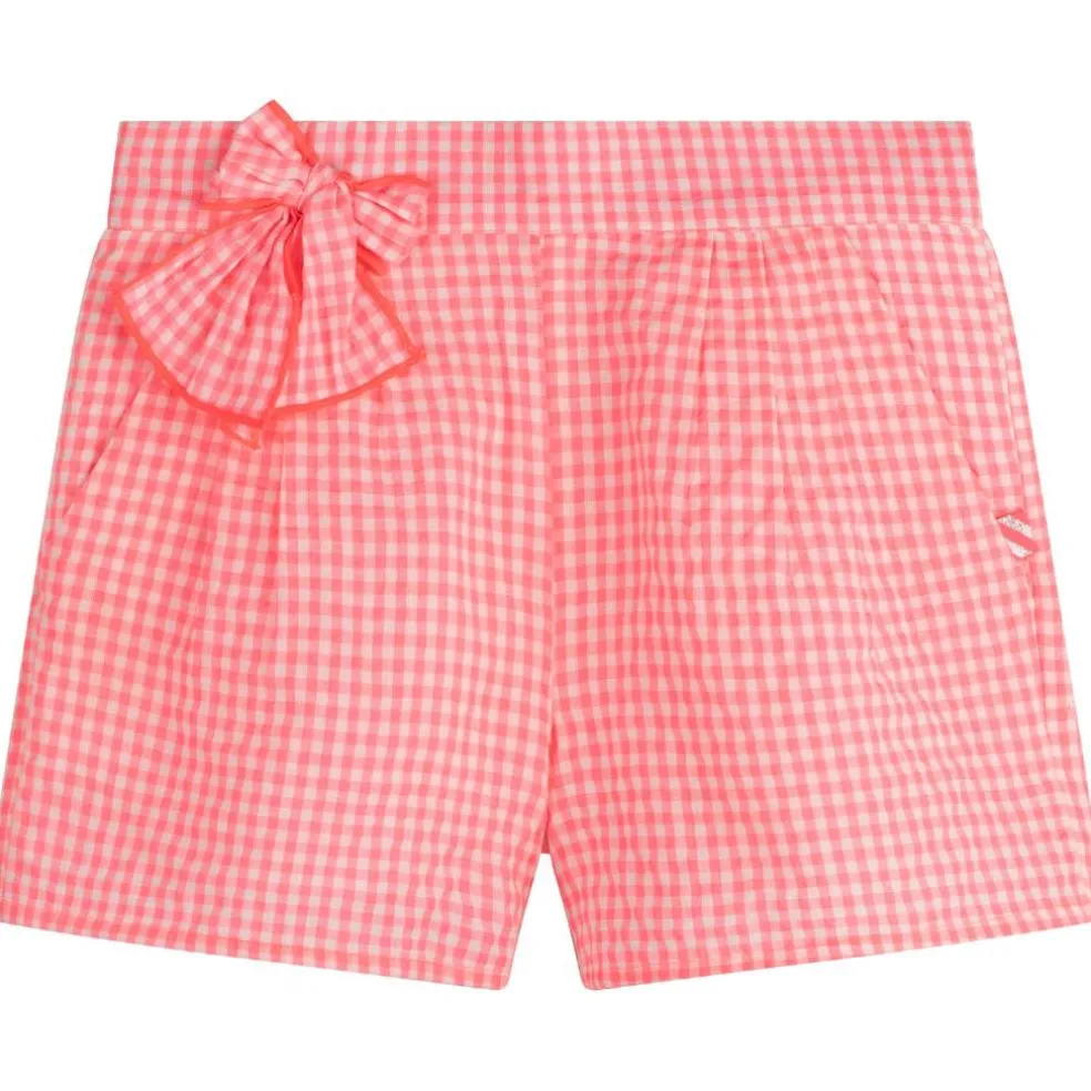 Gingham shorts with adjustable waist. Two front pockets and finished with matching appliqued bow