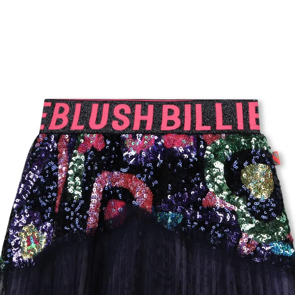 This Billieblush skirt is made of pleated and lined tulle. A sequin-embroidered panel appears on the front. This comfortable garment has a sparkly elasticated waist with a matte Billieblush logo.
