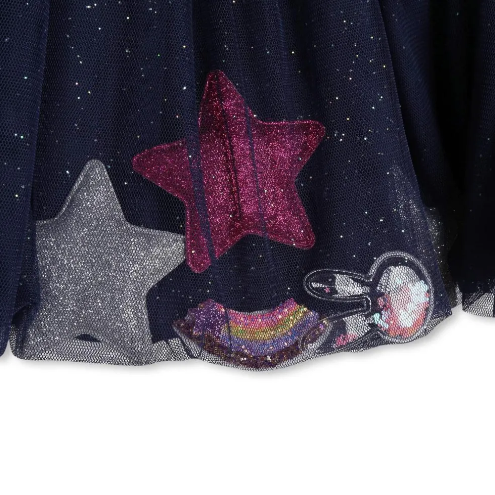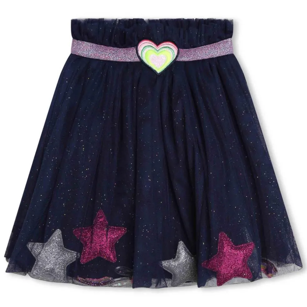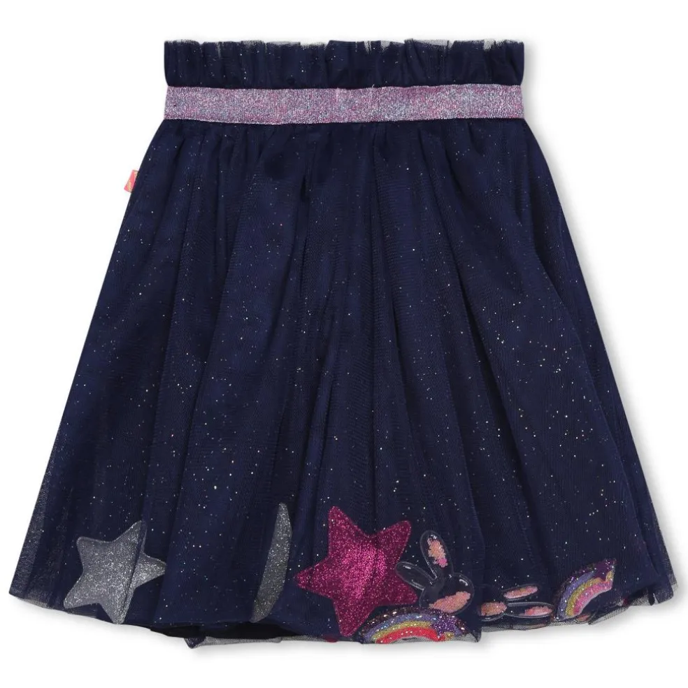 This Billieblush party skirt is made of sparkly lined tulle. The bottom part features multicoloured motifs covered in sequins. This comfortable garment has a high elasticated waist that is gathered. An embroidered heart appears on the sparkly belt.