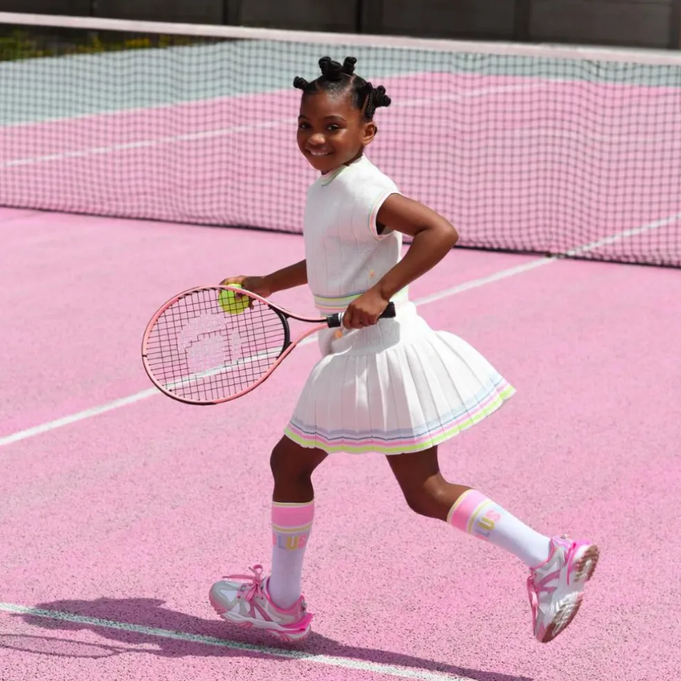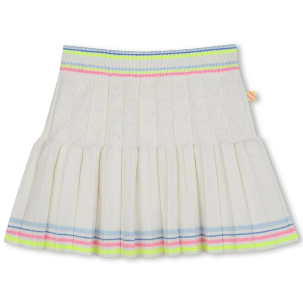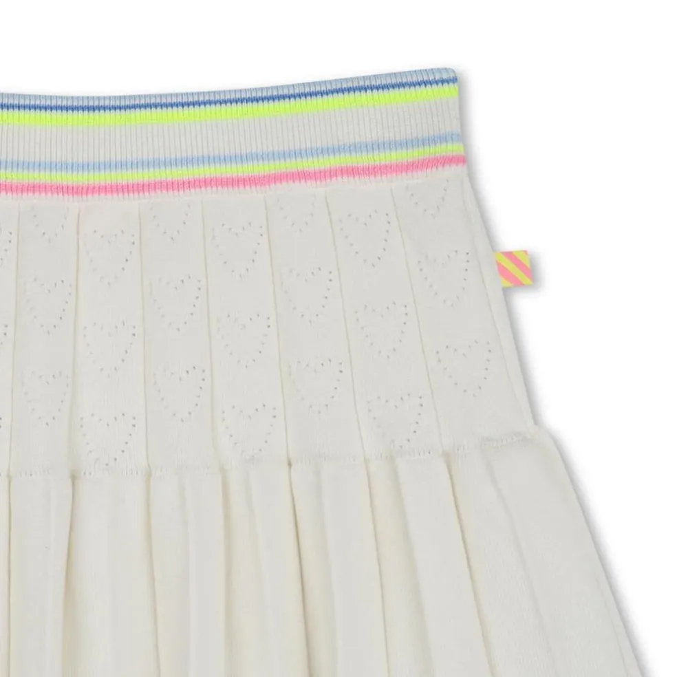 This Billieblush skirt comes in a tricot weave, ideal for everyday wear. It is cut in a retro-inspired skater shape and embellished with openwork hearts and multicoloured stripes around the waist and hem. This skirt is made of cotton-rich fabric and has ribbed trim.