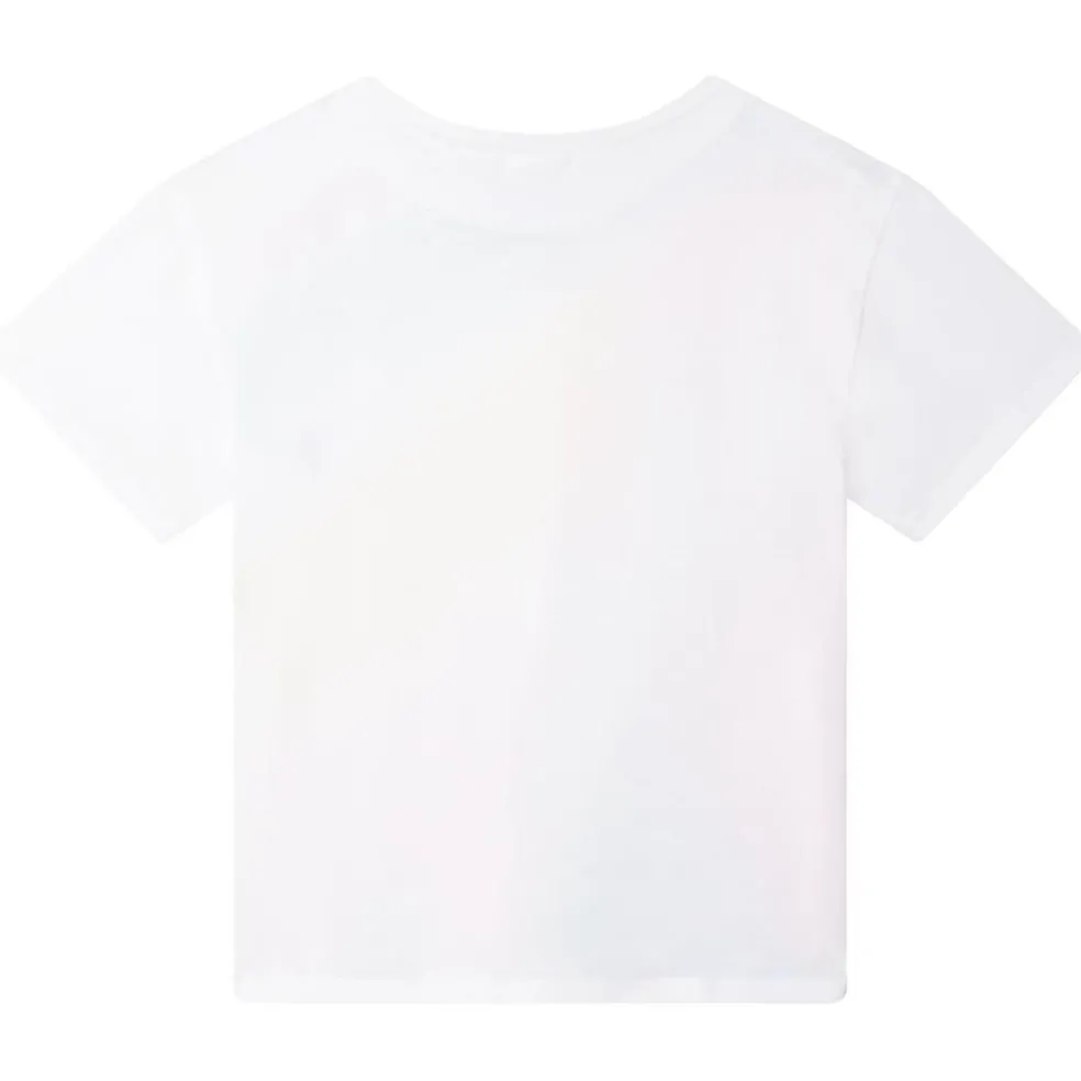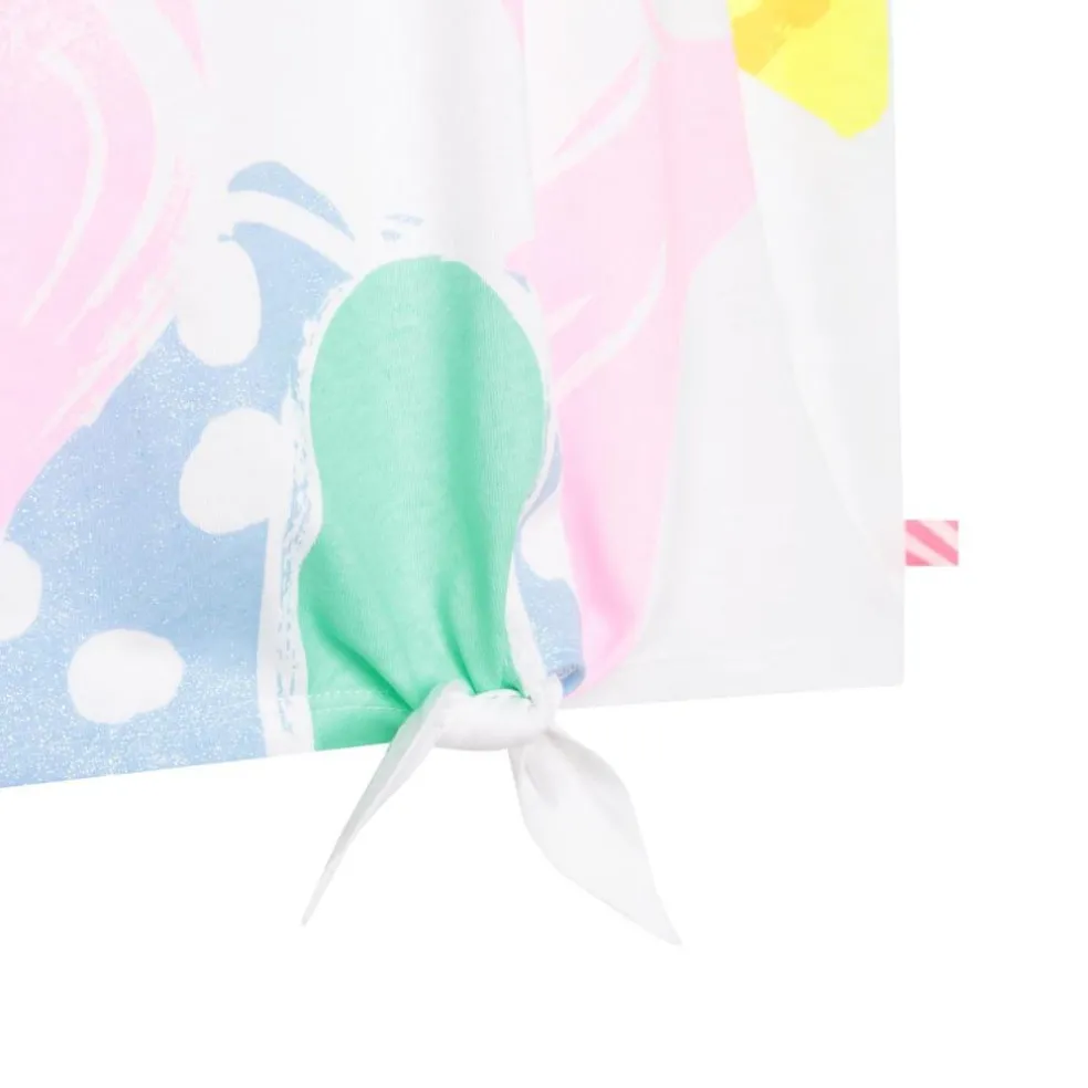 Short sleeved tee shirt with round neckline and bow at bottom. Large face motif on front.
