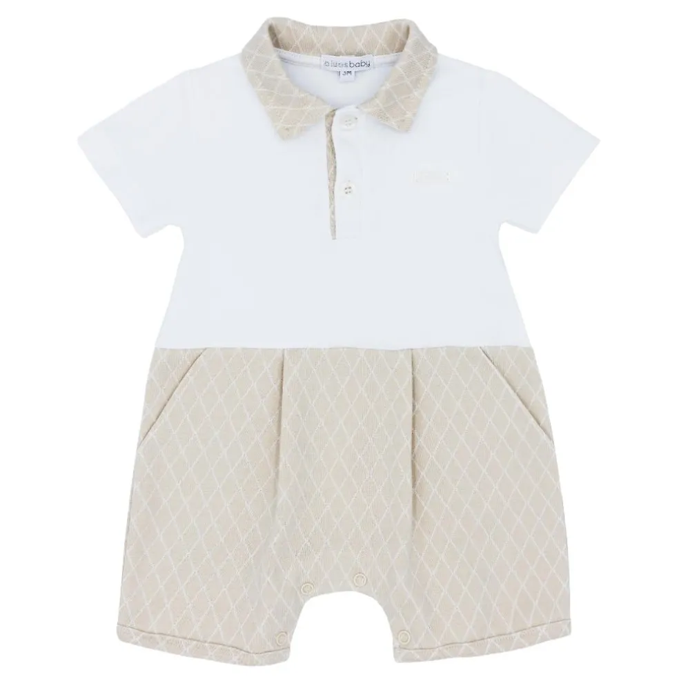 Smart short romper with diamond print beige fabric at the bottom, the body is a soft cotton jersey fabric and is finished with a contrasting beige diamond print collar.