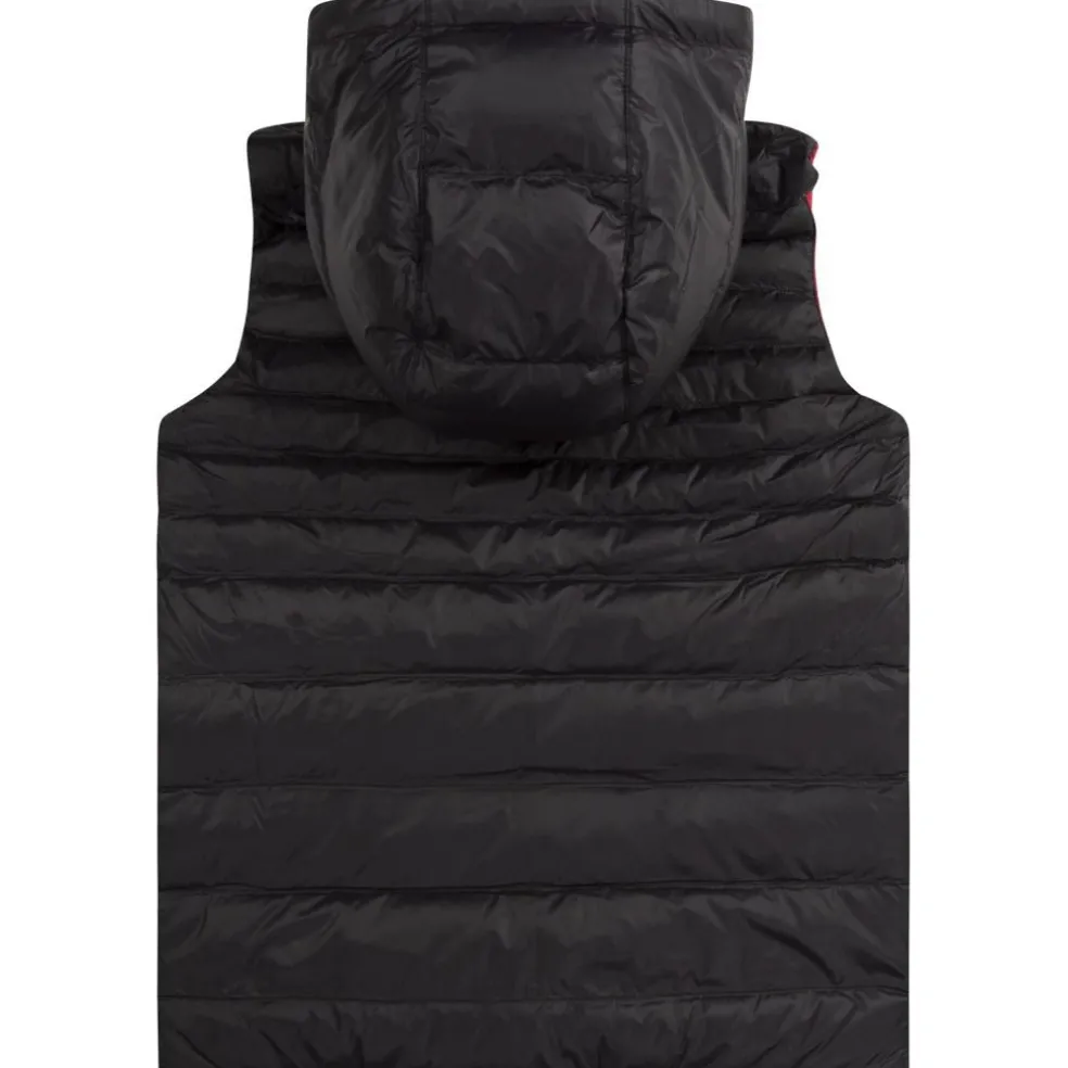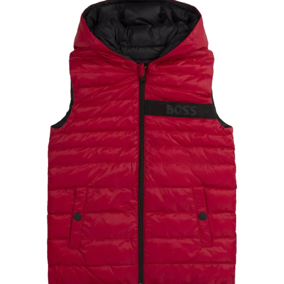 Hooded sleeveless down filled water repellant gilet. Reversible, with zip fastener, and pockets on both sides. Band with “BOSS” jacquard on the chest.