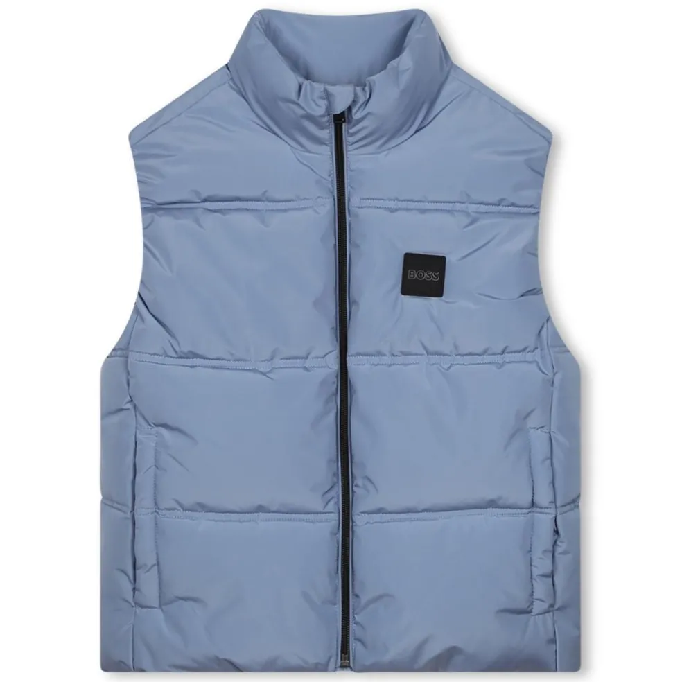 This BOSS water-repellent sleeveless puffer jacket keeps you warm while retaining a casual look. It is made of 100% polyester with a zip fastening and side pockets and features the BOSS logo in a contrasting print at the bottom of the back.