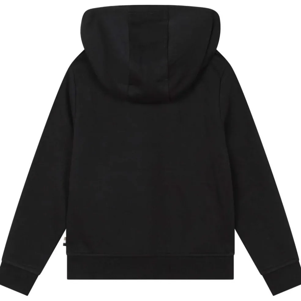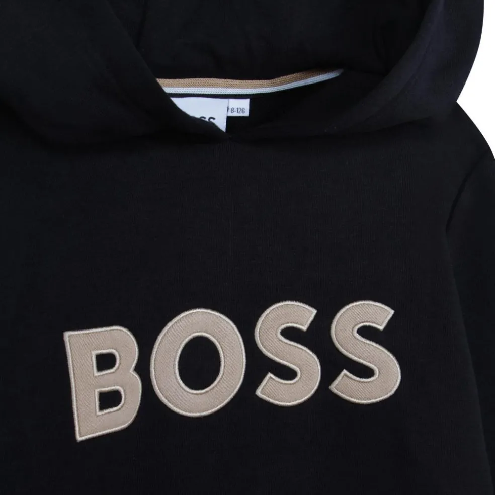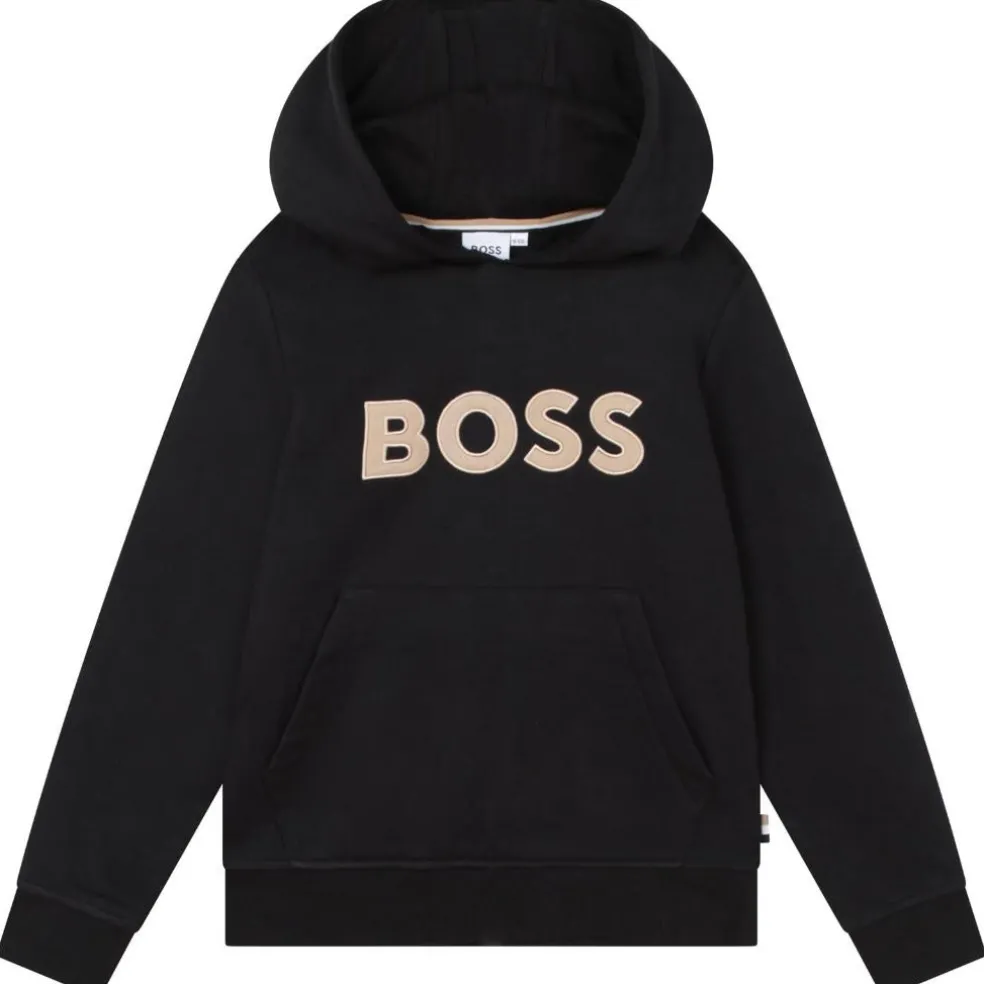 Hooded sweatshirt with “BOSS” print and kangaroo pocket in front.