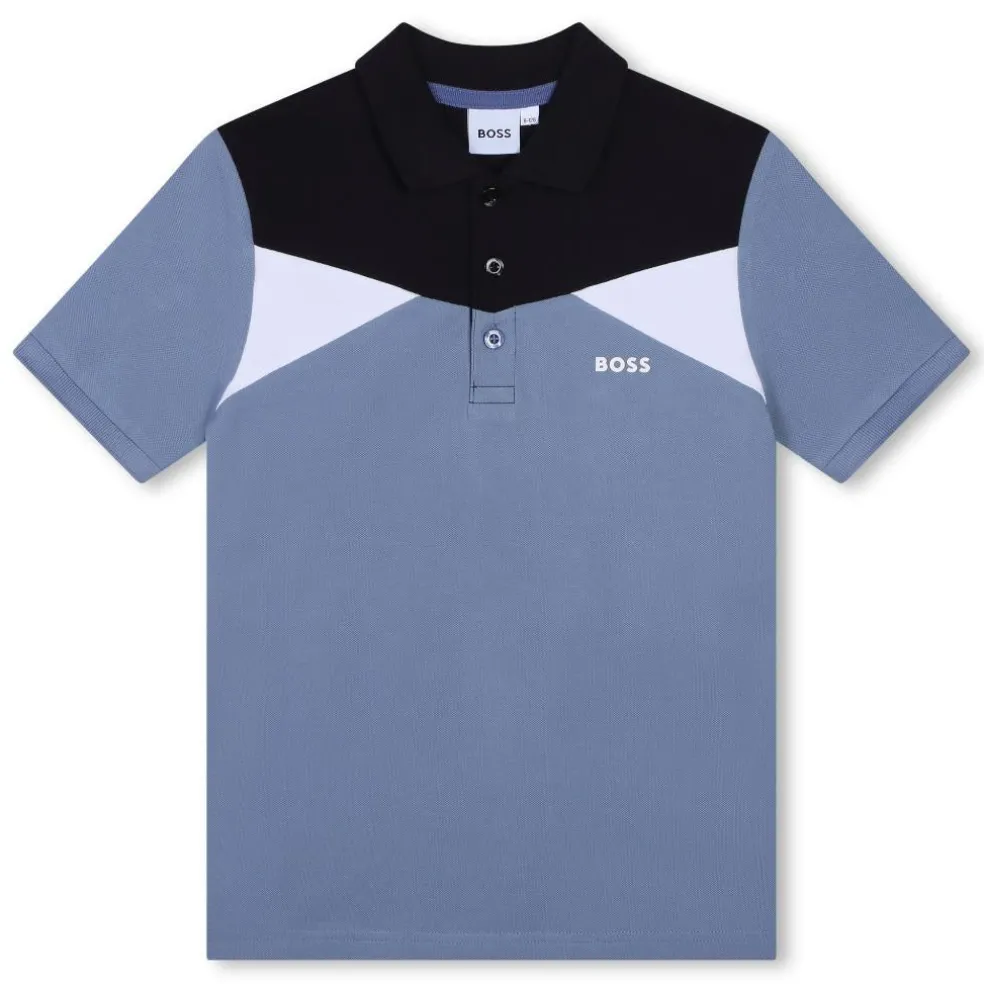 This BOSS short-sleeved polo features colourful shoulder panels. A logo is printed on the chest and a logo label appears on the side. This polo is made of 96% cotton and 4% elastane.