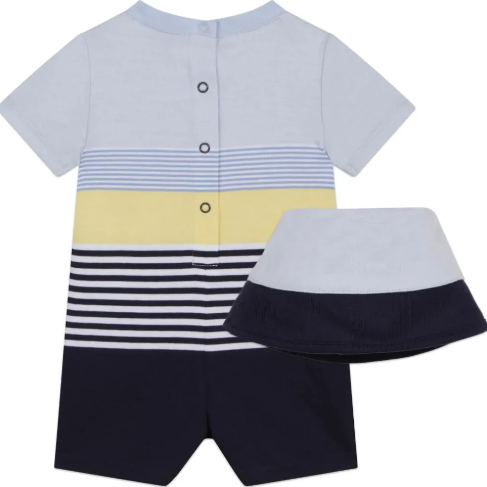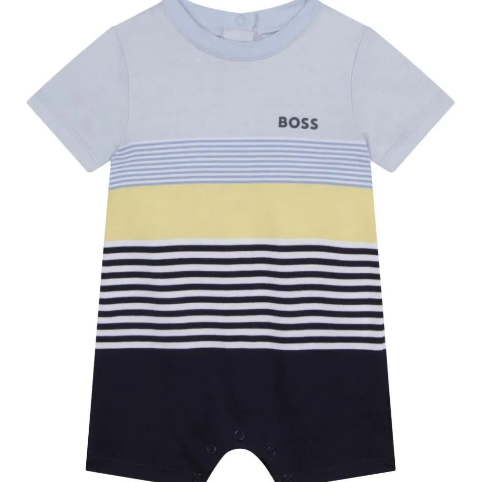 Set of all in one and hat in jersey 100% organic cotton with snap closure on the back and crotch. Allover contrasting stripe, “BOSS” printed logo on the chest. Matching hat with ‘BOSS’ logo.