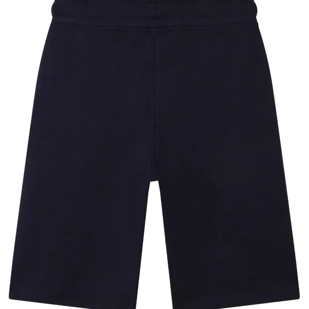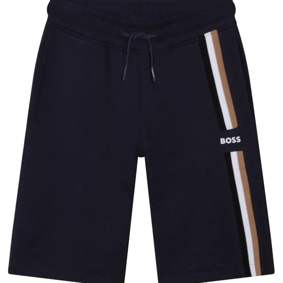 Cotton/polyester/elastane track bermuda shorts with elasticated waist and drawstring. Vertical stripes and printed ‘BOSS’ logo on the side.