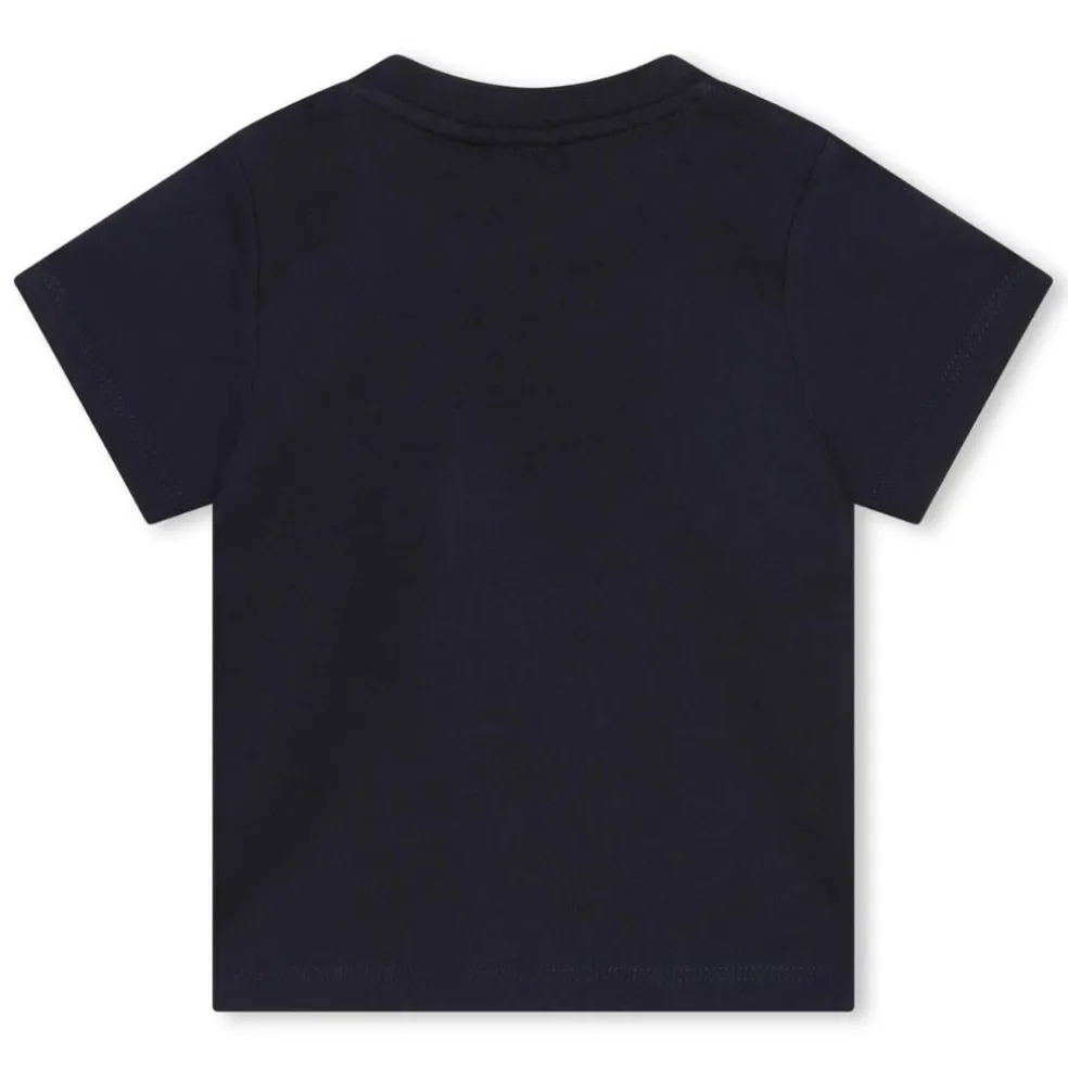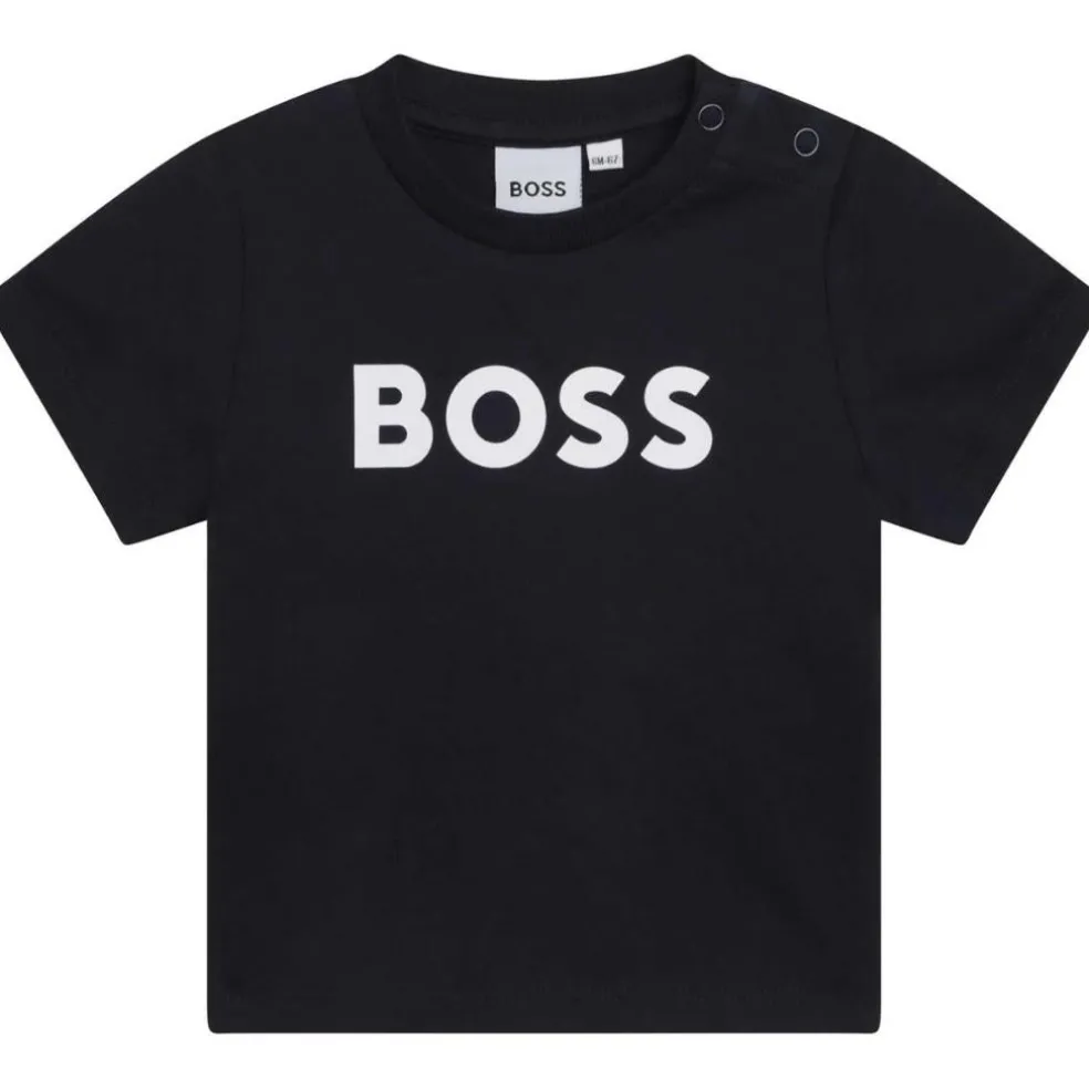 This 100% cotton short-sleeved T-shirt has a ribbed round neck and features a contrasting flocked BOSS logo on the chest. A press-stud fastening at the shoulder makes for easy dressing.