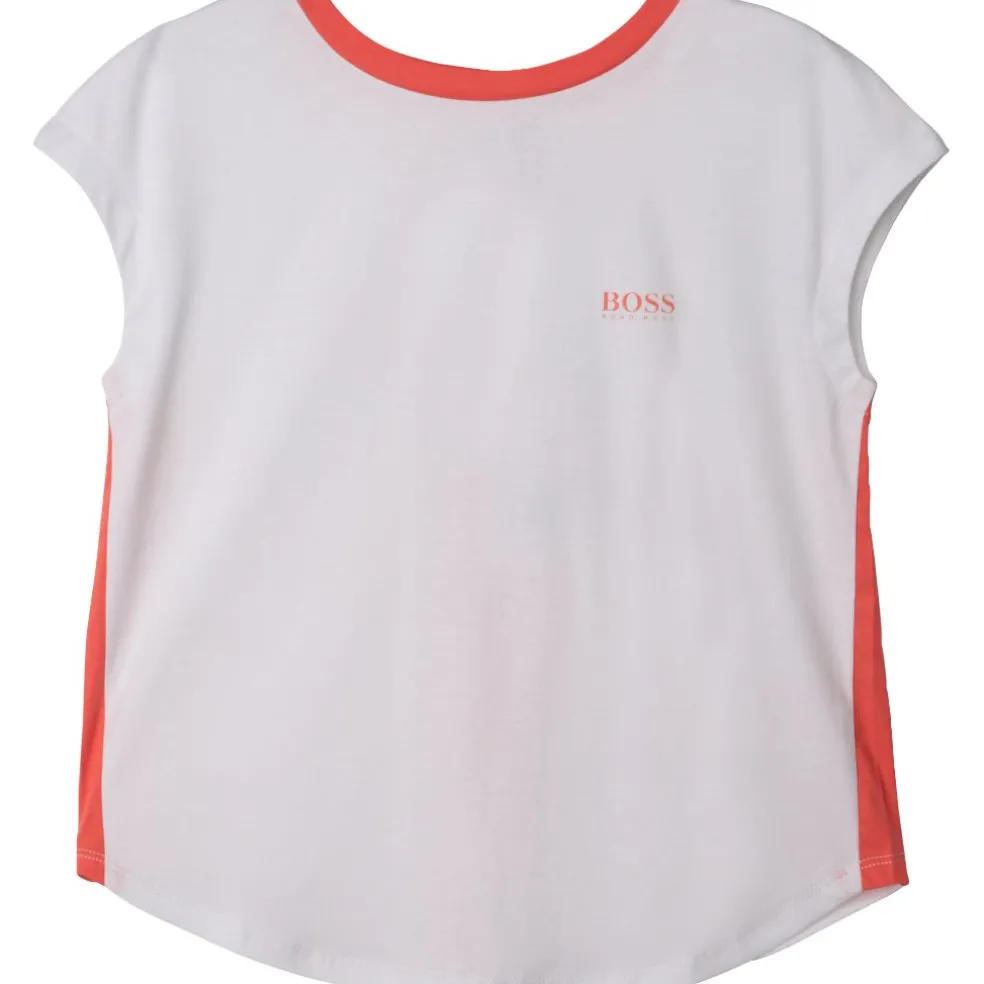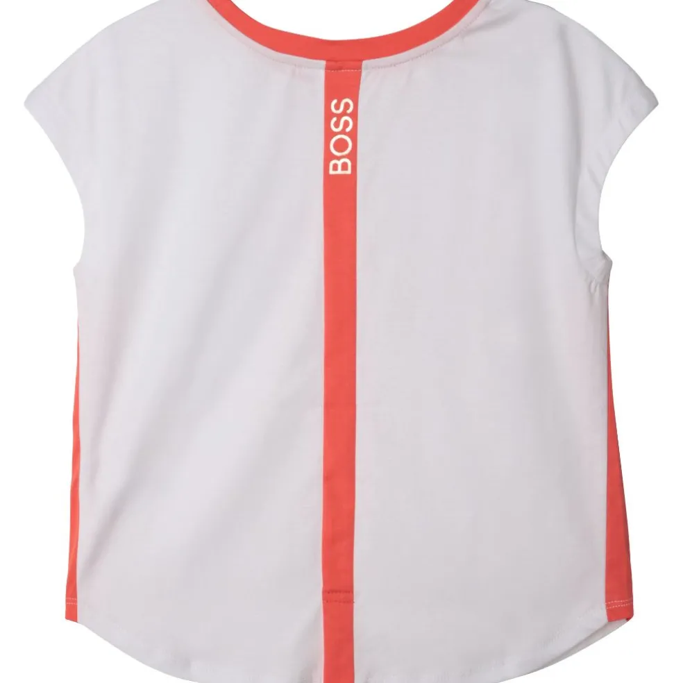 Short sleeved t-shirt, back and side yokes in contrasting peach colour and printed Boss logo on front and back.