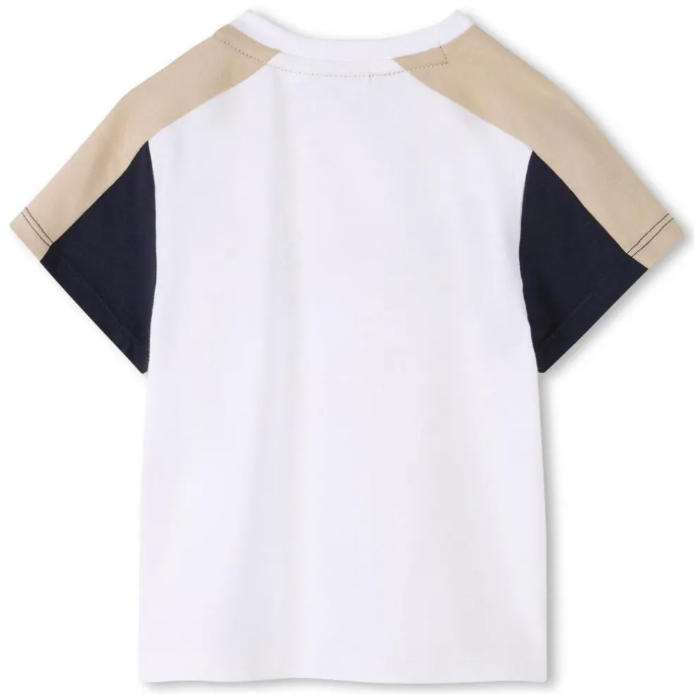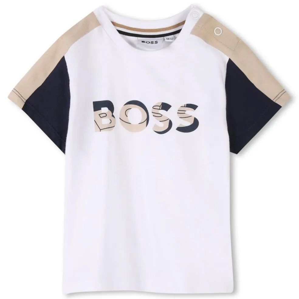White and beige shorts set for baby boys by BOSS. Made from soft cotton, this set consists of white t-shirt with the Boss logo print in beige and navy blue on the front. It has beige trim on the shoulder and navy blue sleeves. Fastens with poppers on one shoulder for easy dressing. Matching beige shorts with the brands logo print on one leg. They have two pocket styling and finished with an elasticated waist for comfortable fit.