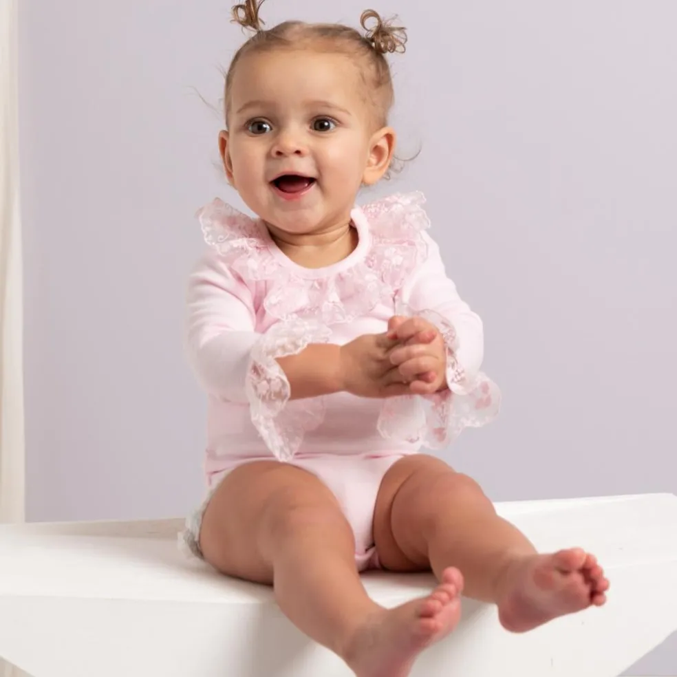 Long sleeved body, finished with a lace ruffle trim to collar and cuffs.