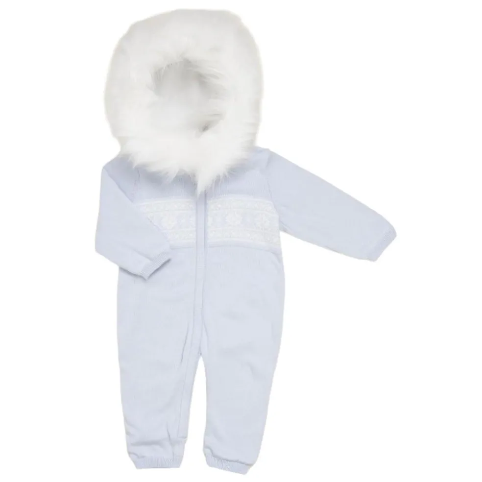 Cotton knit pramsuit fully lined with a soft jersey lining, front zip fastening and detachable faux fur trim to the hood.