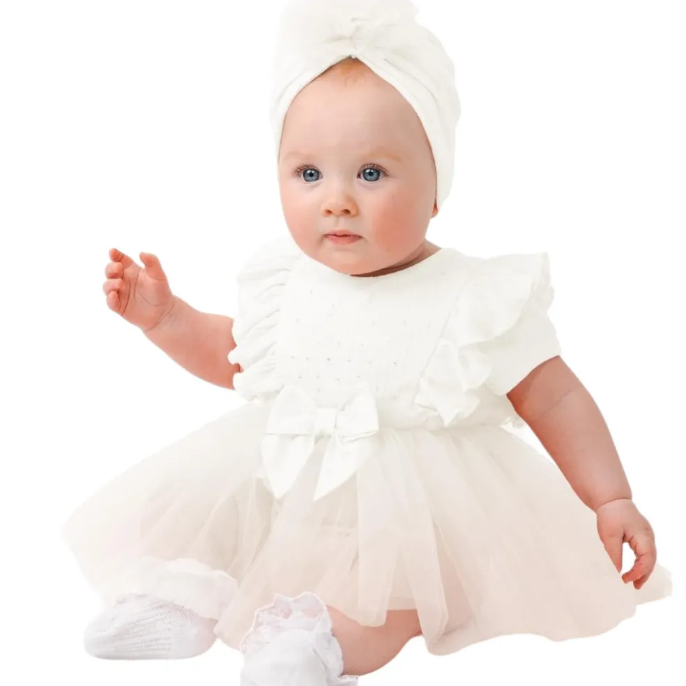 Gorgeous short sleeved body, finished with ruffles and diamantes in a stretchy ribbed fabric with an attached tulle skirt and an appliqued bow at the waist.
