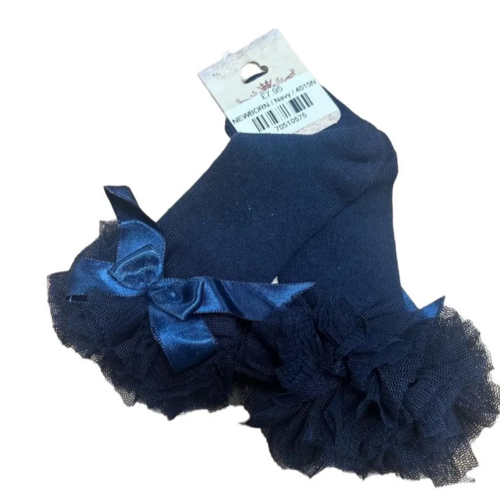 Knee high socks with voile frills finished with satin appliquéd bows.