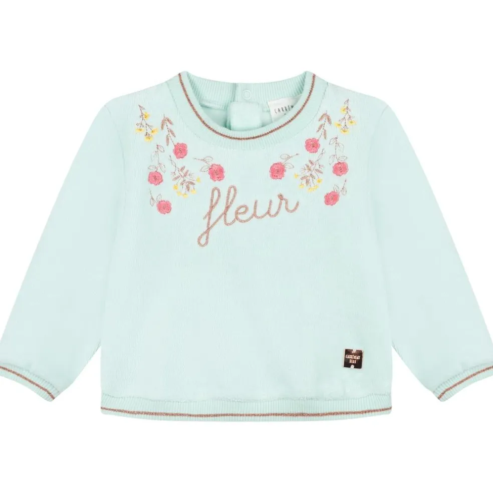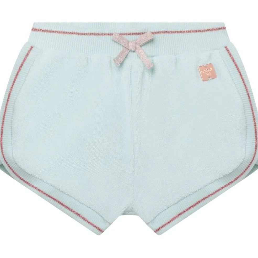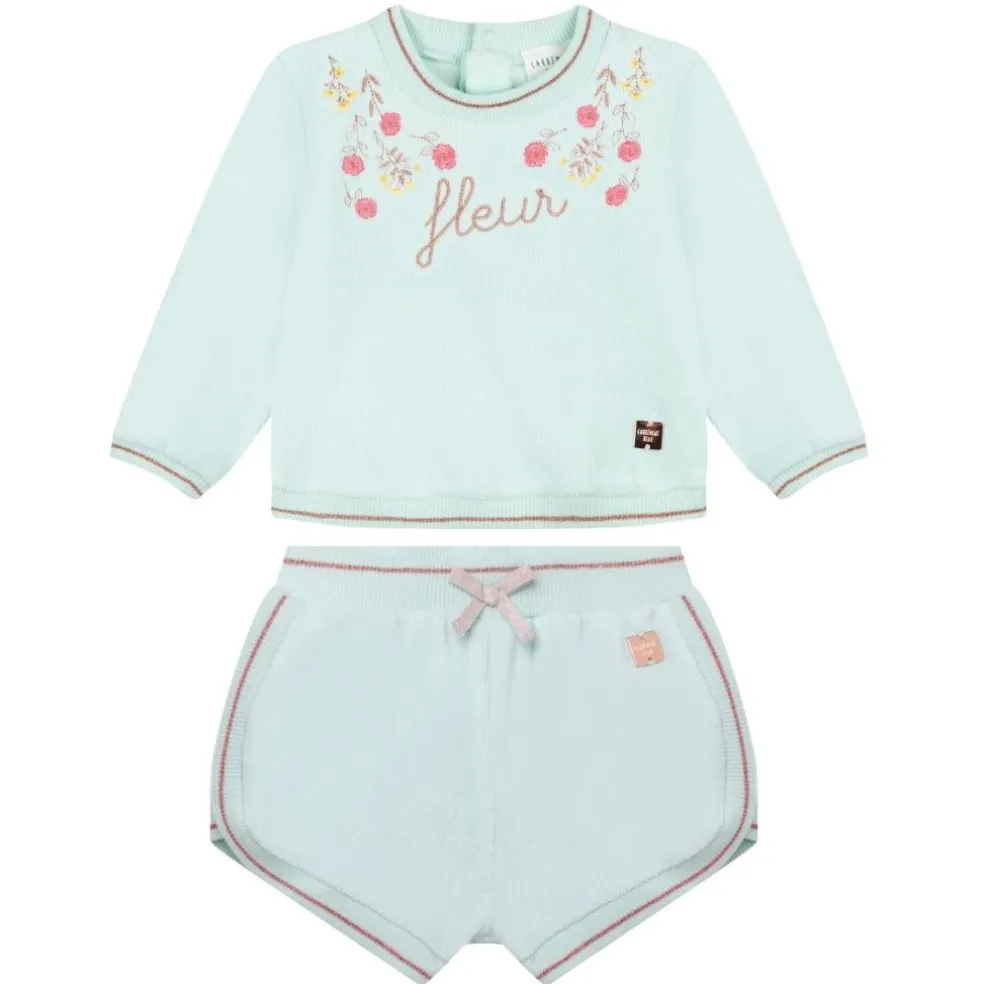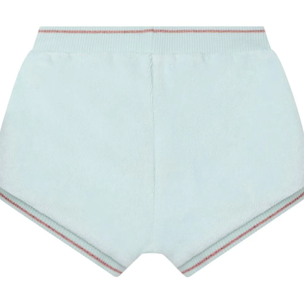 Long sleeved top with round neckline, snap closure on the back, ribbed hems on bottom of sleeves and body, Matching shorts with elasticated waist and fancy bow, ribbed hems at waist.