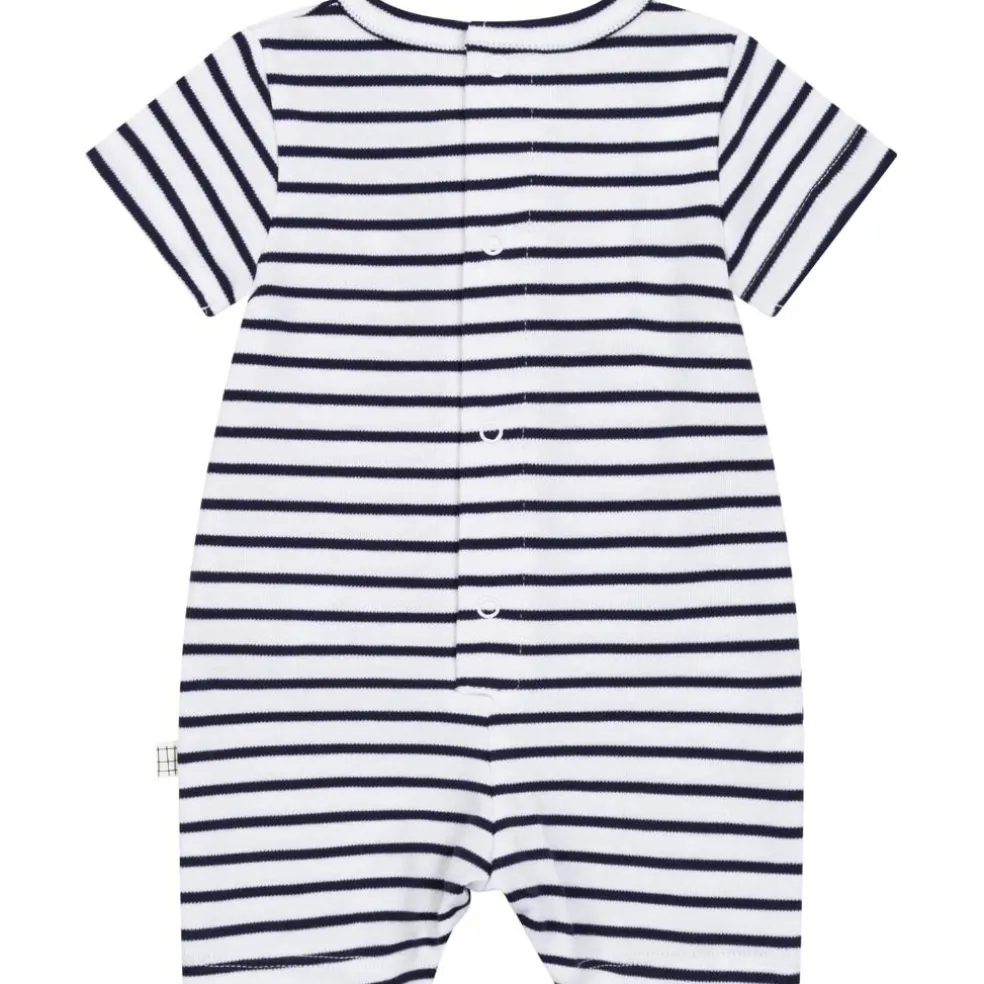 This Carrément Beau short playsuit has short sleeves and is composed of 100% organic cotton. The striped design is enhanced with a lion’s head on the front. This playsuit has press studs on the back and between the legs.