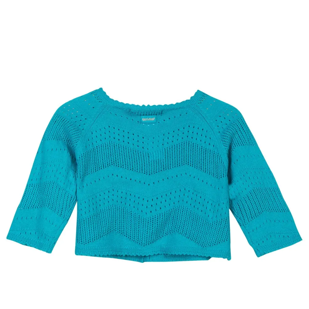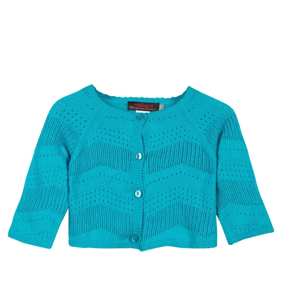 This fresh turquoise button-up cardigan adds a warm and colourful layer to all your little girl’s outfits, with its openwork pointelle knit. Crew neck, 4-button fastening. Sophisticated scalloped edge finish. Long raglan sleeves.