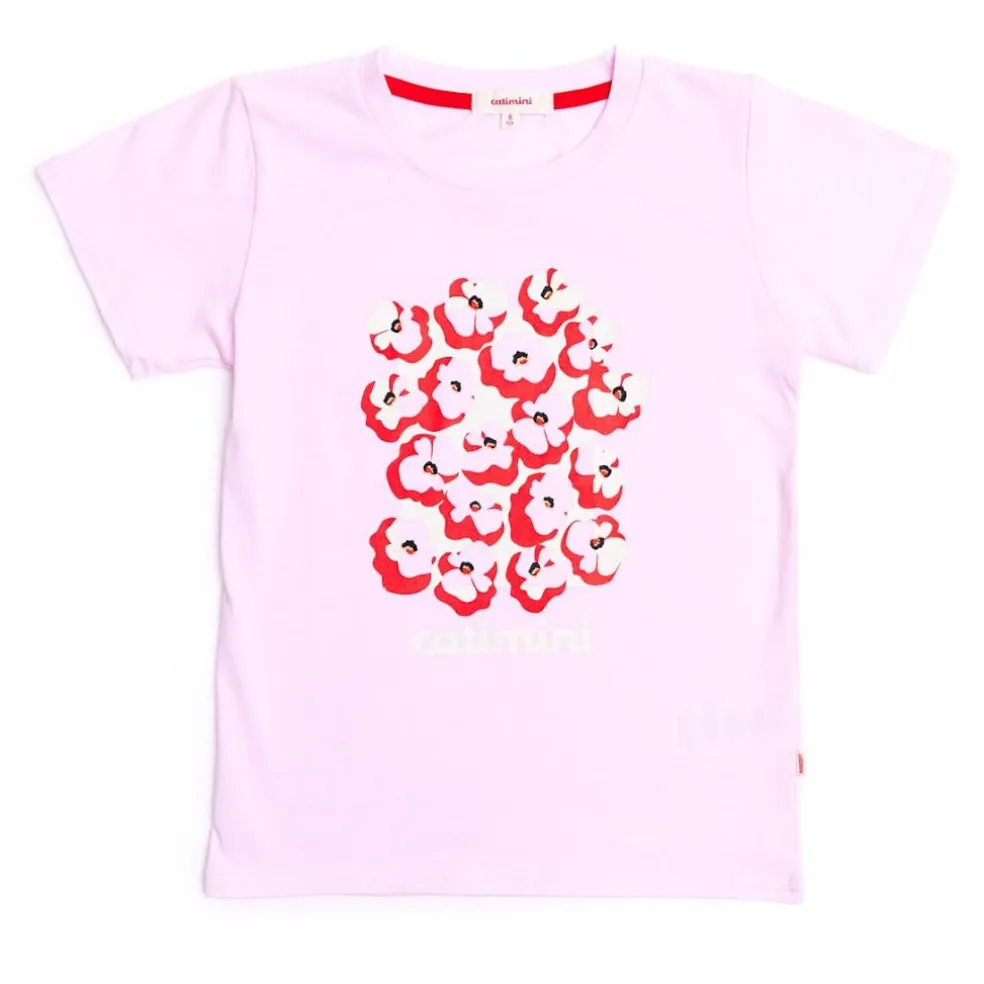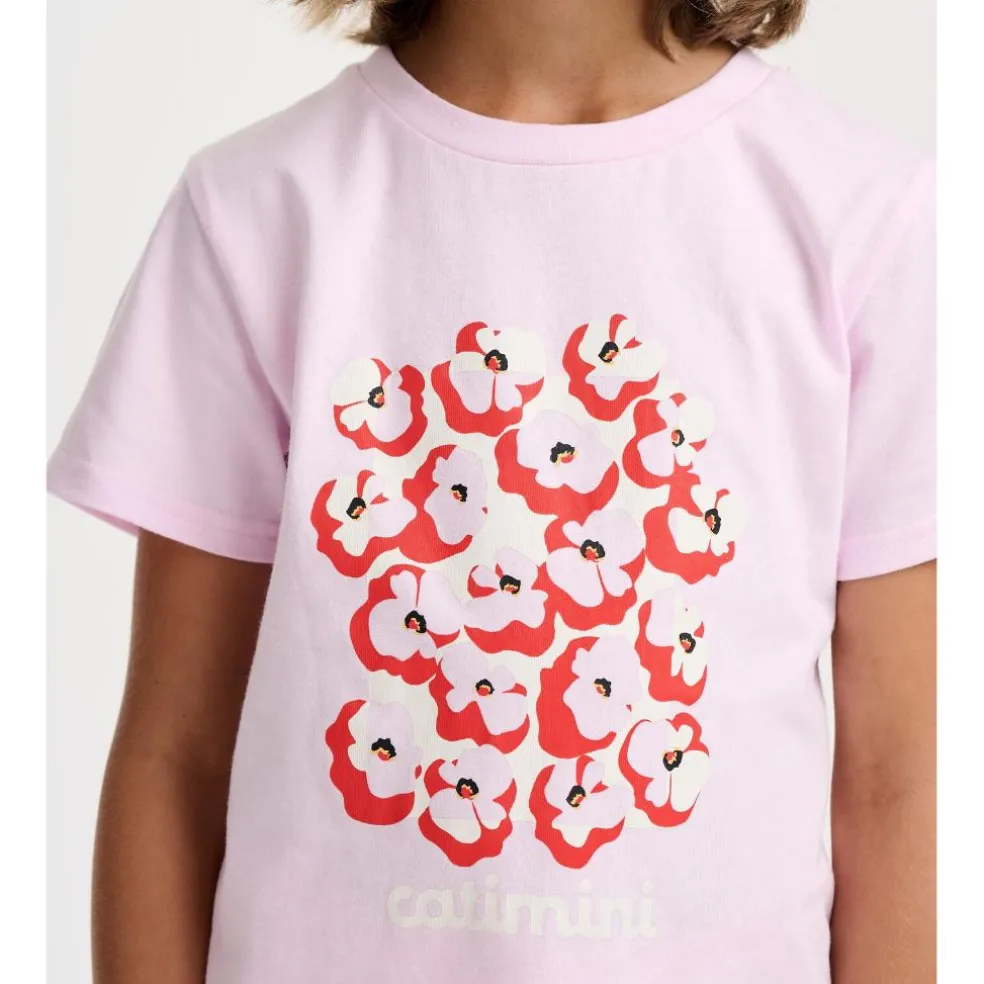 Short sleeved sweatshirt with a round neckline in a lovely shade of pale pink and featuring the iconic Catimini poppy print on the front.