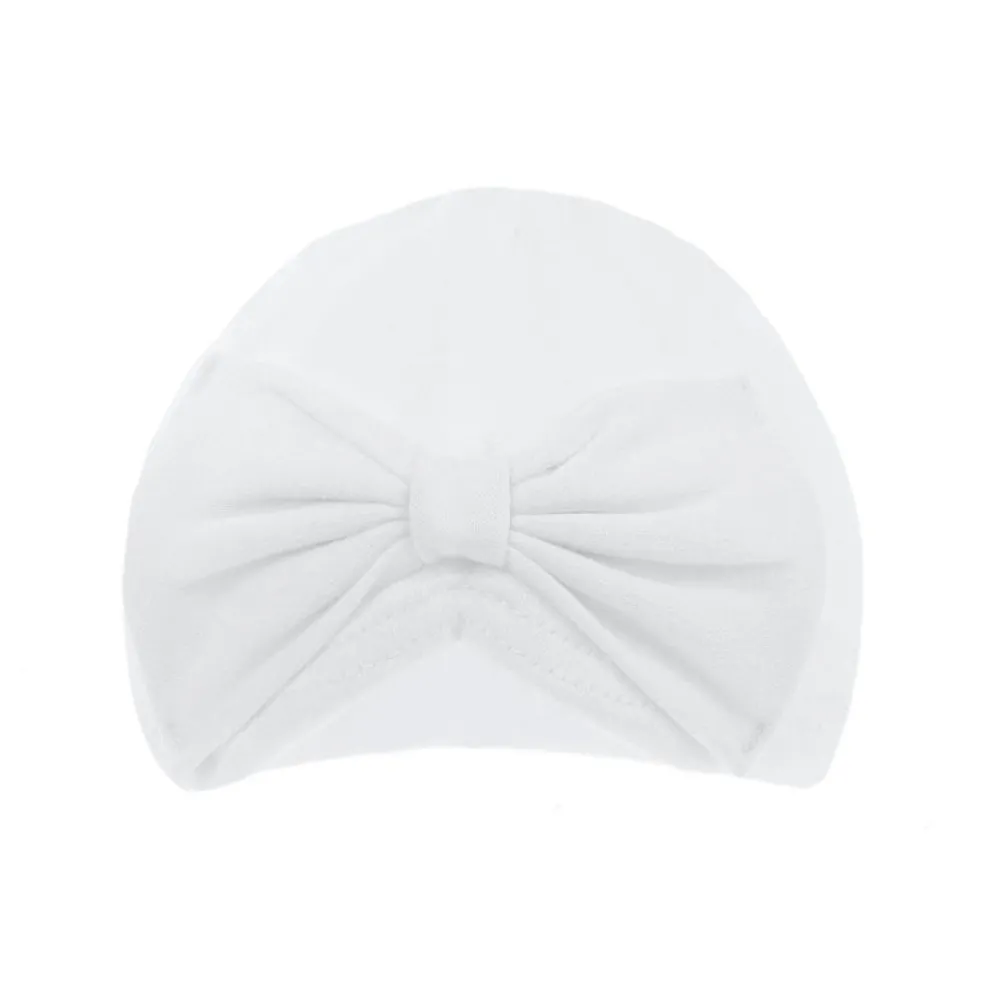 Cotton turban style hat with appliqued bow on the front.