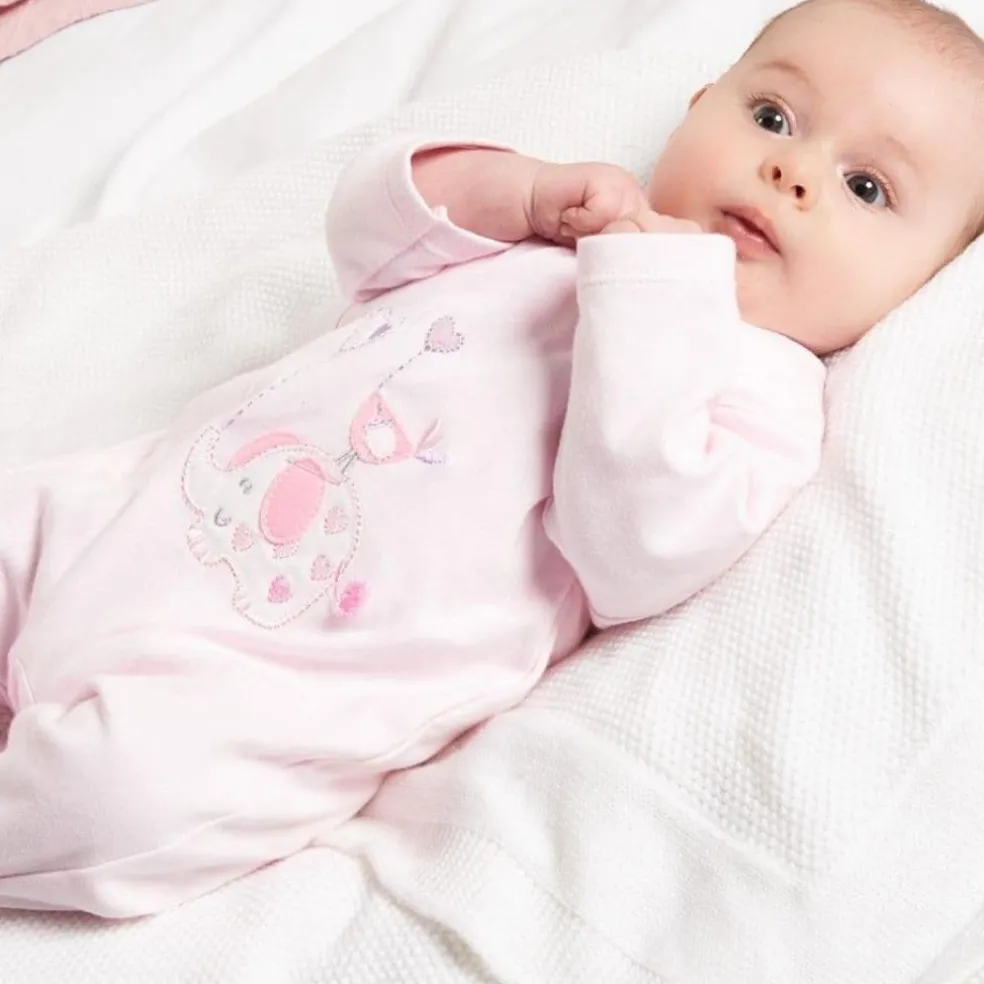 Front fastening cotton all in one with a cute elephant, bird and balloon design appliqued on the front.
