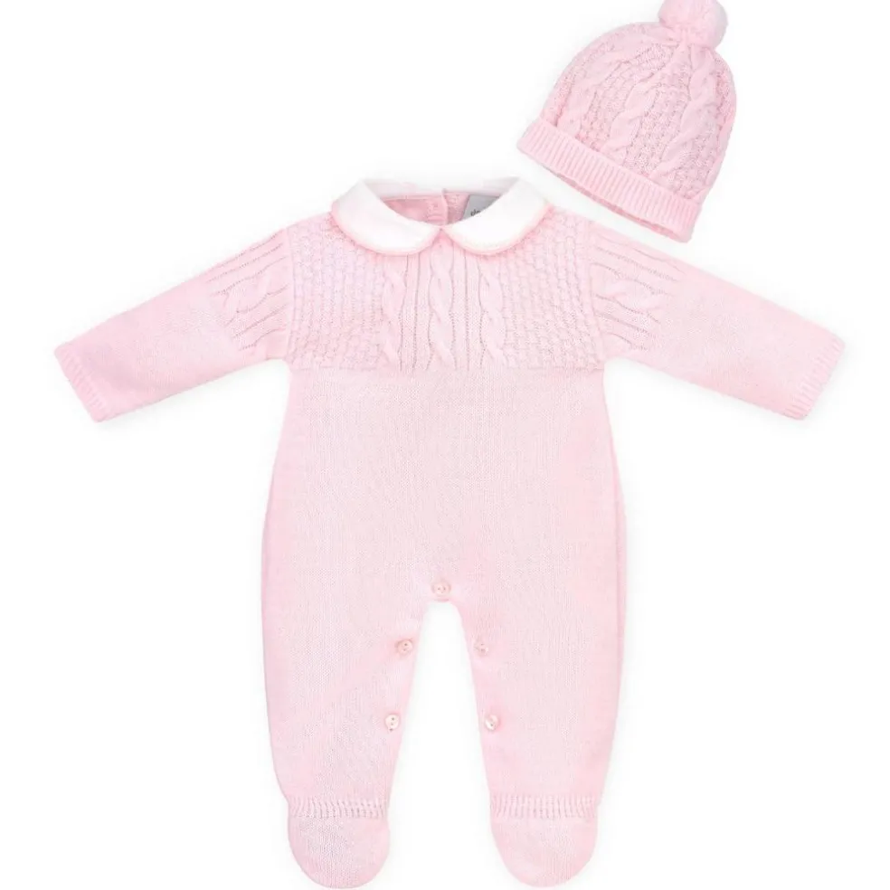 Knitted all in one with a cable & basket weave pattern with a contrasting round collar and is supplied with a matching bobble hat which has a cable knitted design.