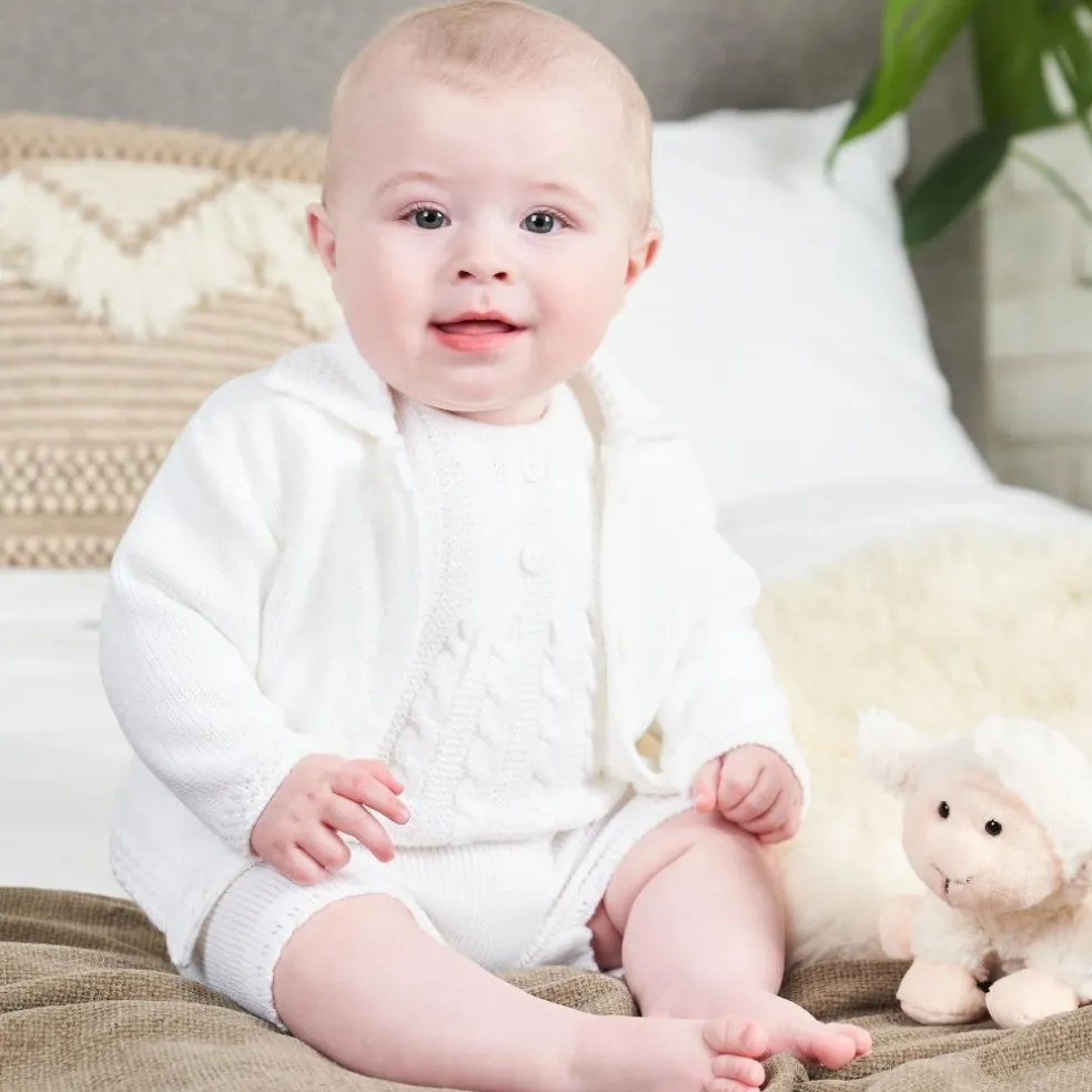 Beautiful knitted baby cardigan finished with a fancy collar and front button fastening, manufactured in Portugal.
