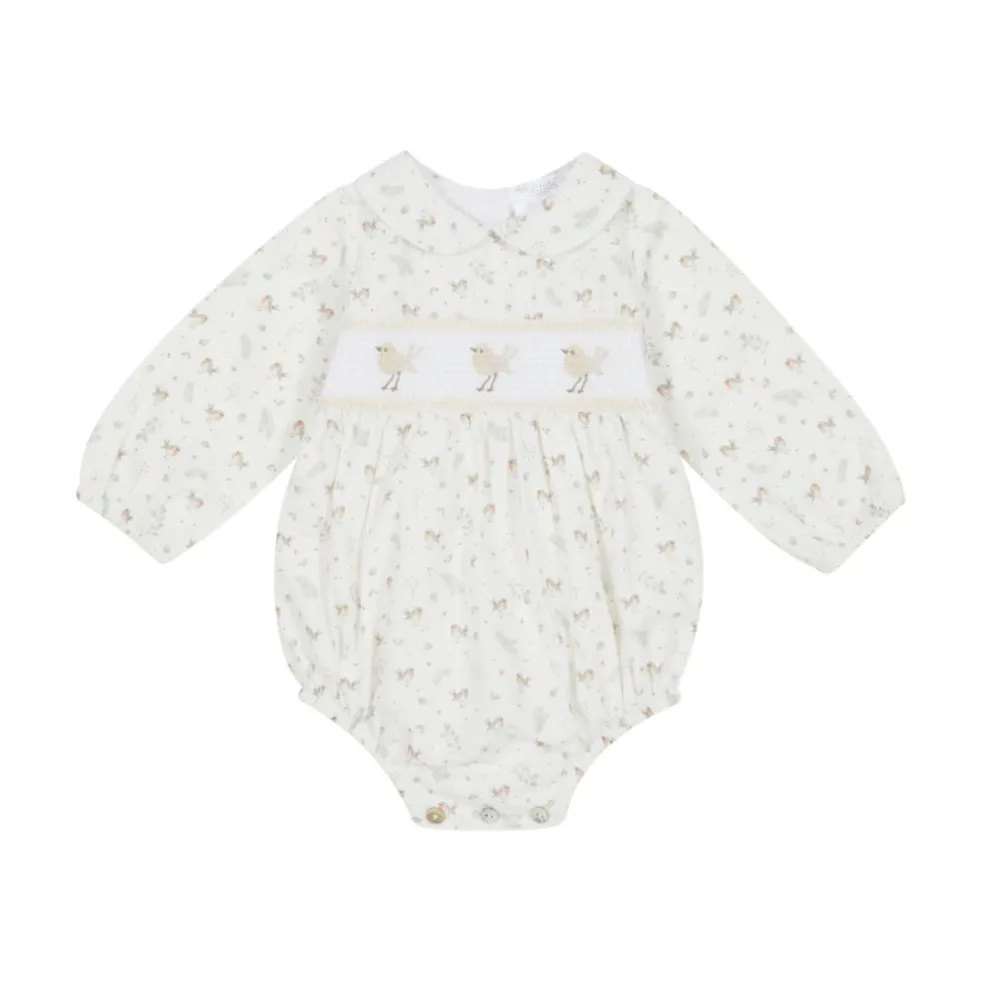 Fully lined short romper in a robin print cotton fabric, it is elasticated around the legs and at the cuffs and is finished with a band of smocking across the chest with embroidered robbins.
