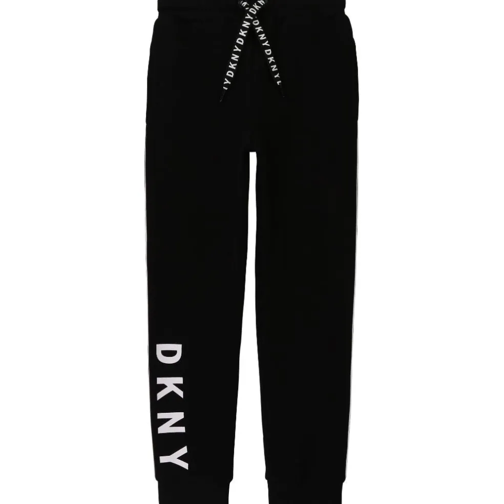 Jogging pants with printed DKNY logo at the bottom of one leg and elasticated waistband with logo drawstring tie.