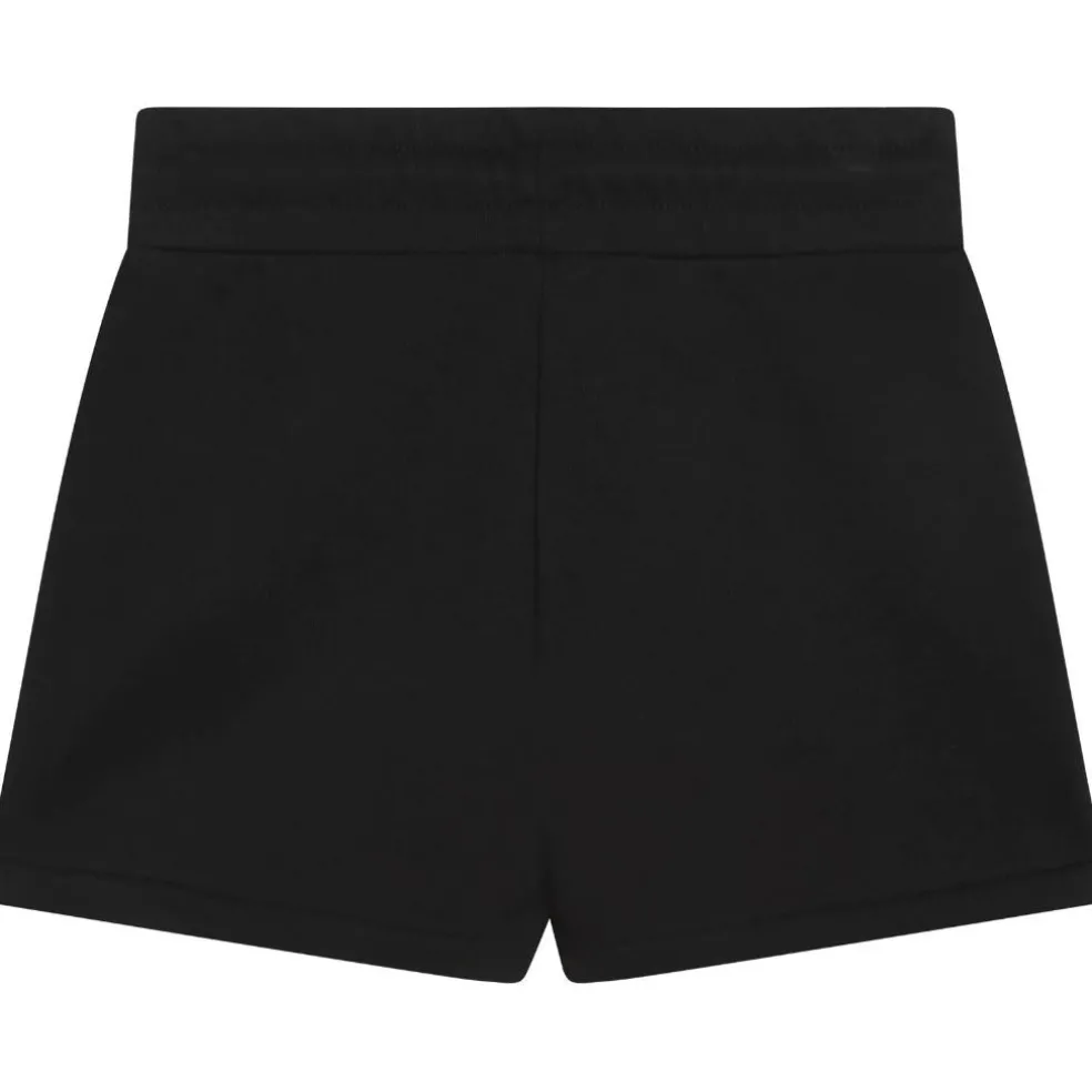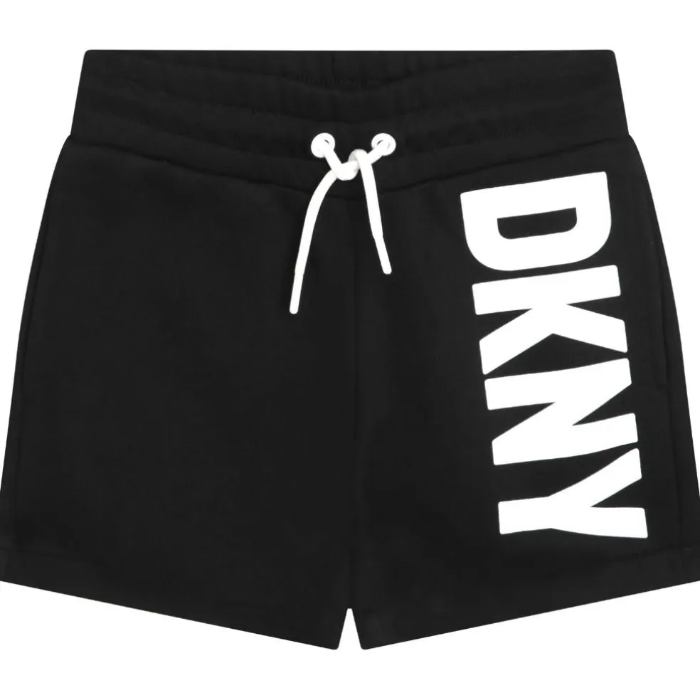 Polyester cotton french terry shorts with elasticated waist and drawstring ties. DKNY branded on the front.