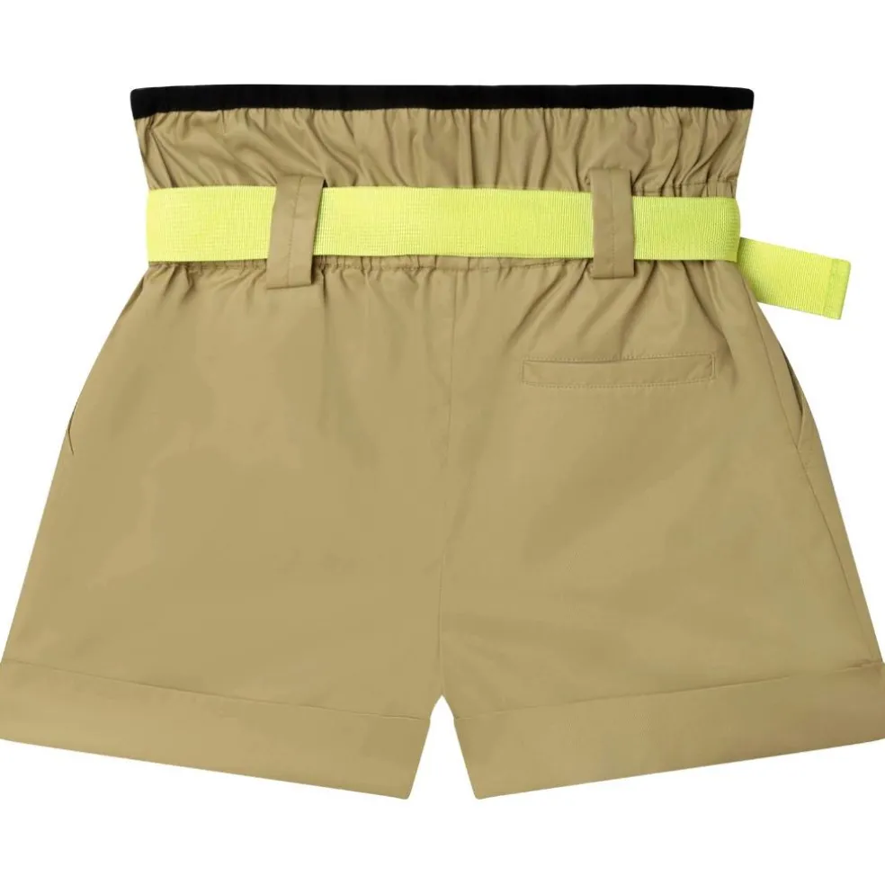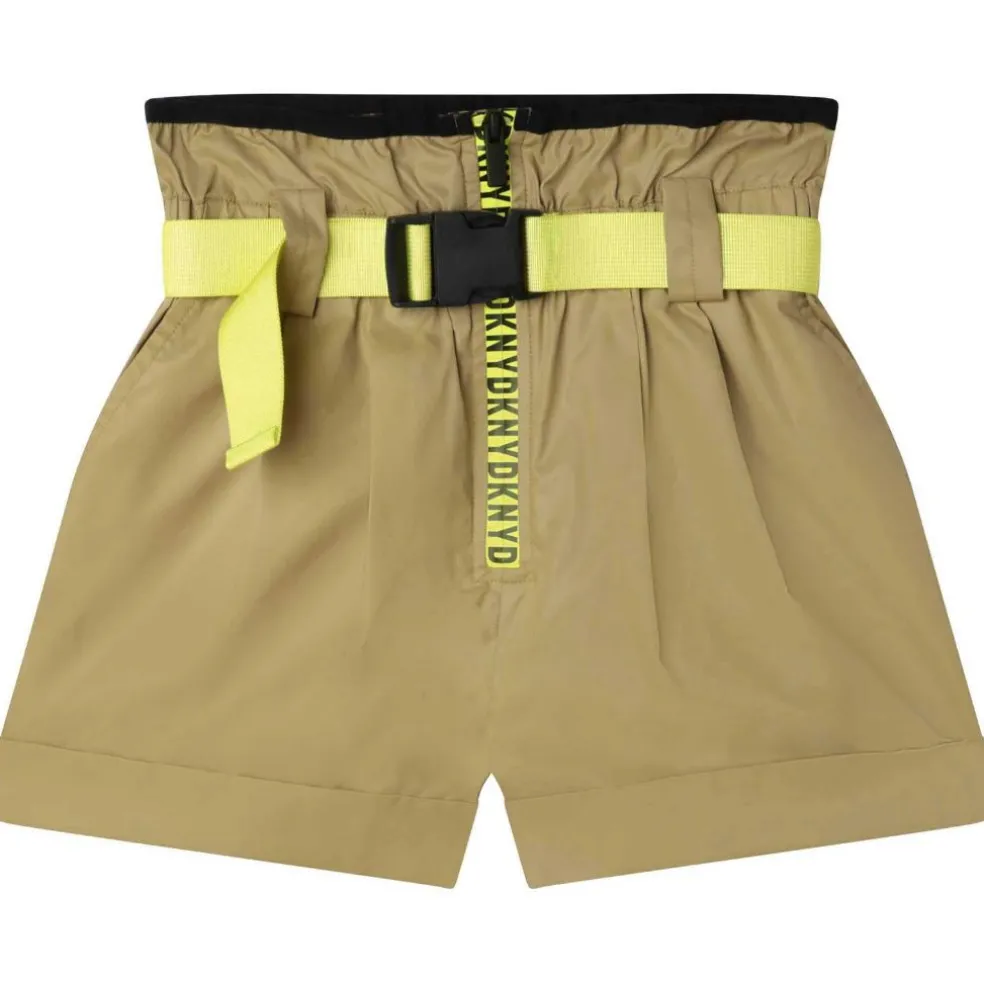Shiny twill polyamide shorts with matching belt, DKNY zipped fastener on the front. Pockets on sides and one at the back.