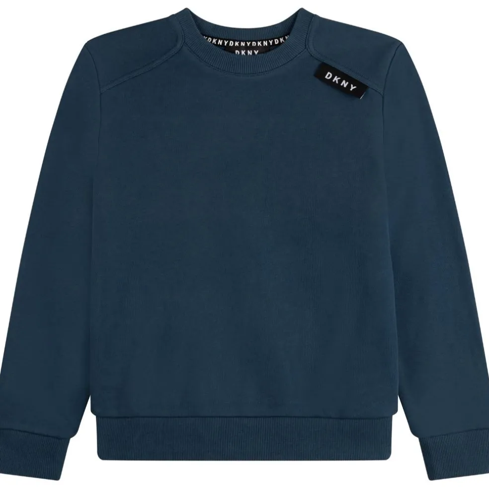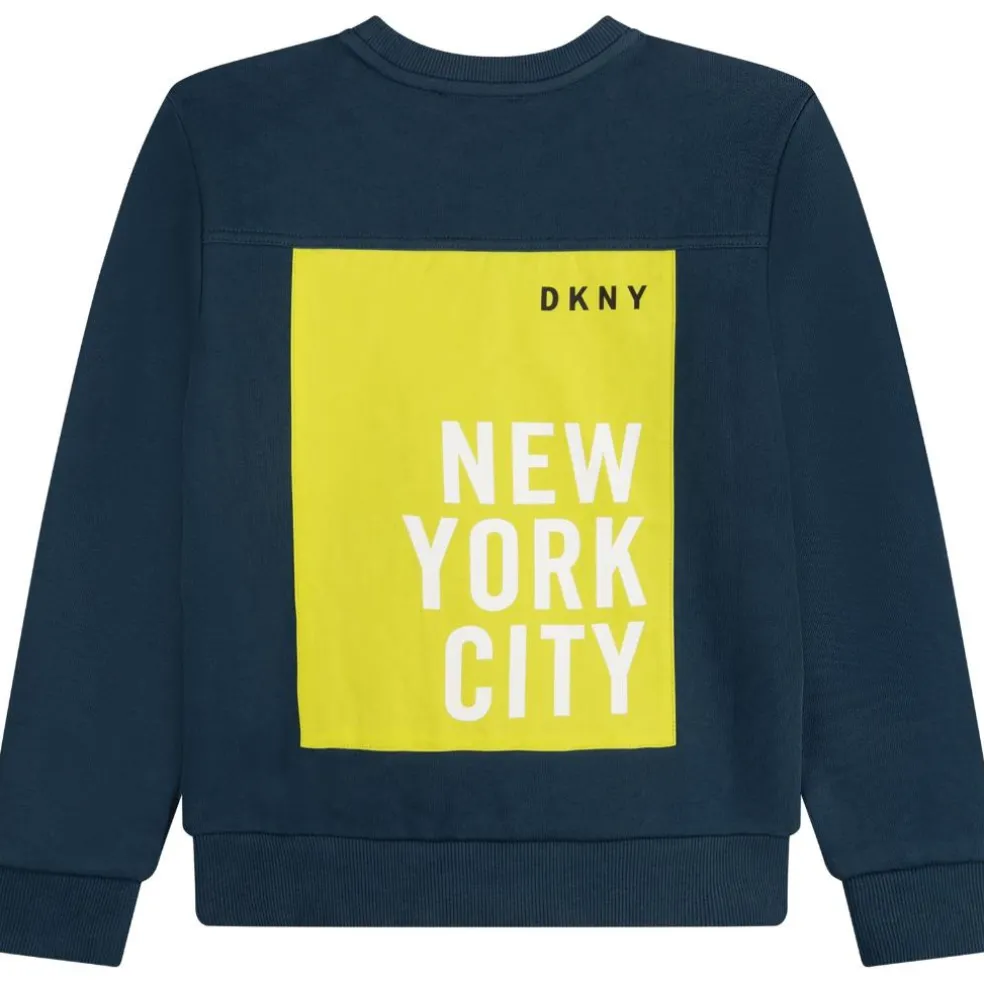 This DKNY fleece sweatshirt is made of cotton. A woven DKNY tag appears on one of the panels on the front of the shoulder. The back has a contrasting twill panel with a DKNY print and raised writing.