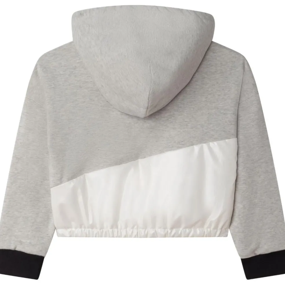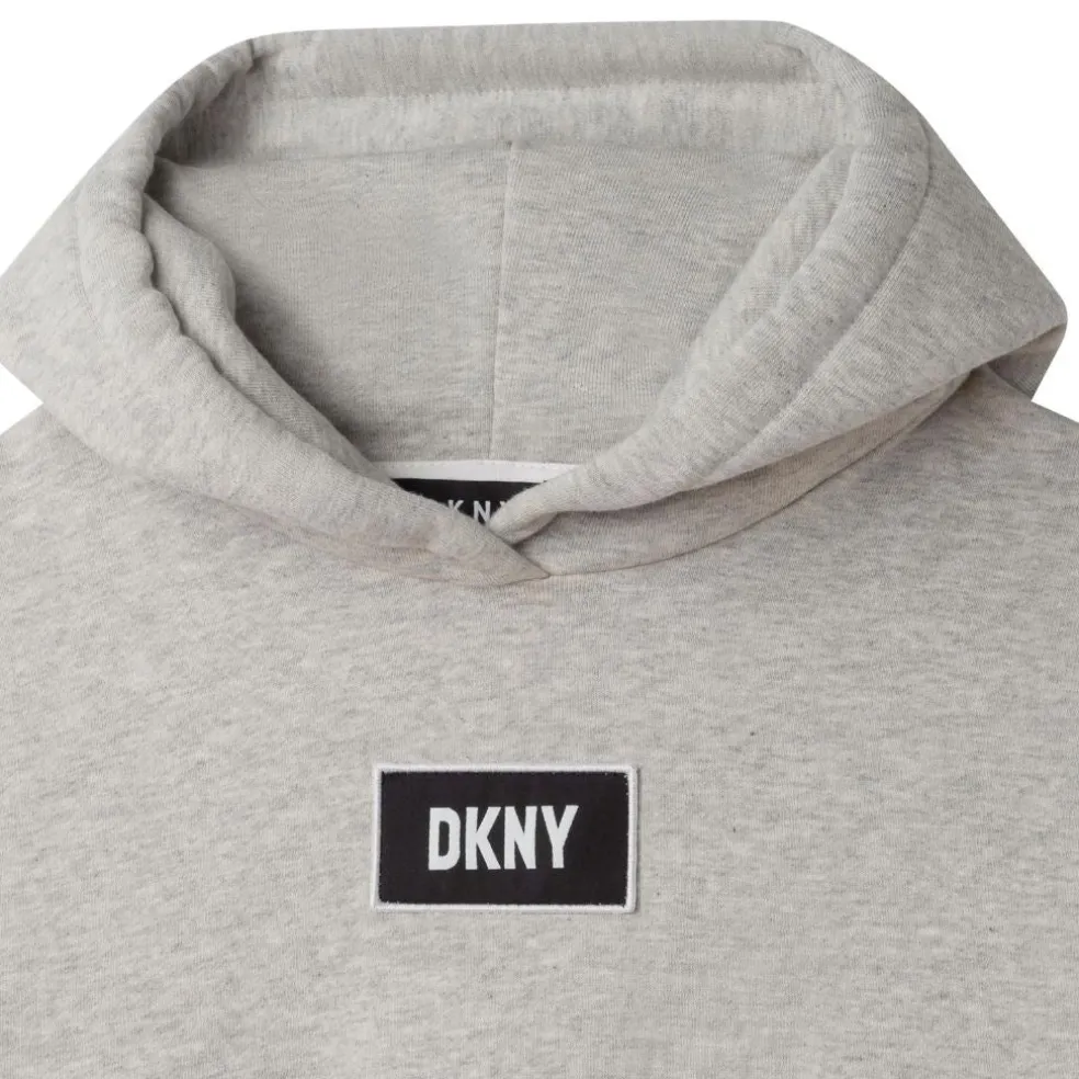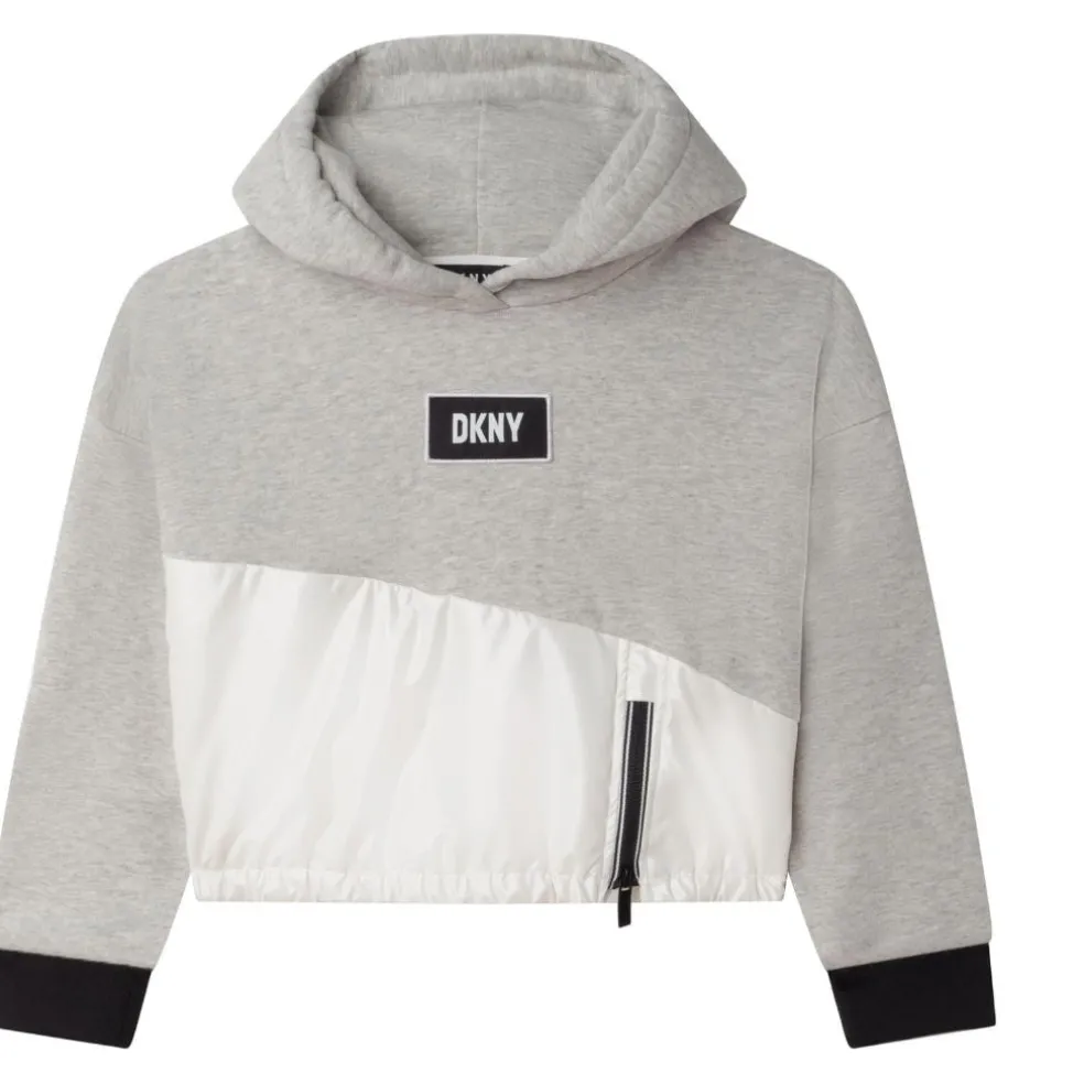 Cotton french terry hooded sweatshirt, bottom part in pearly polyester material. with zip fastener pocket. DKNY sewn badge on front.