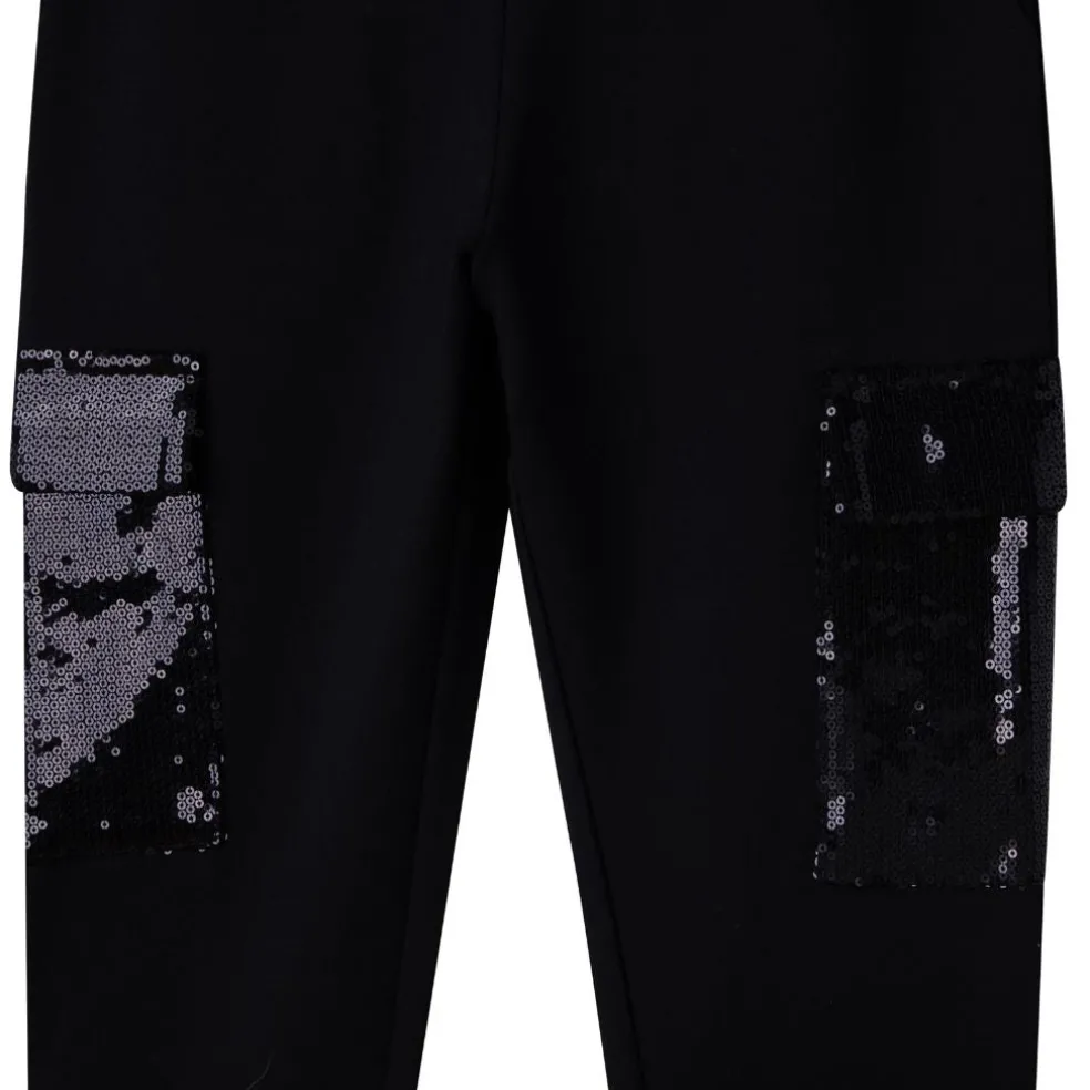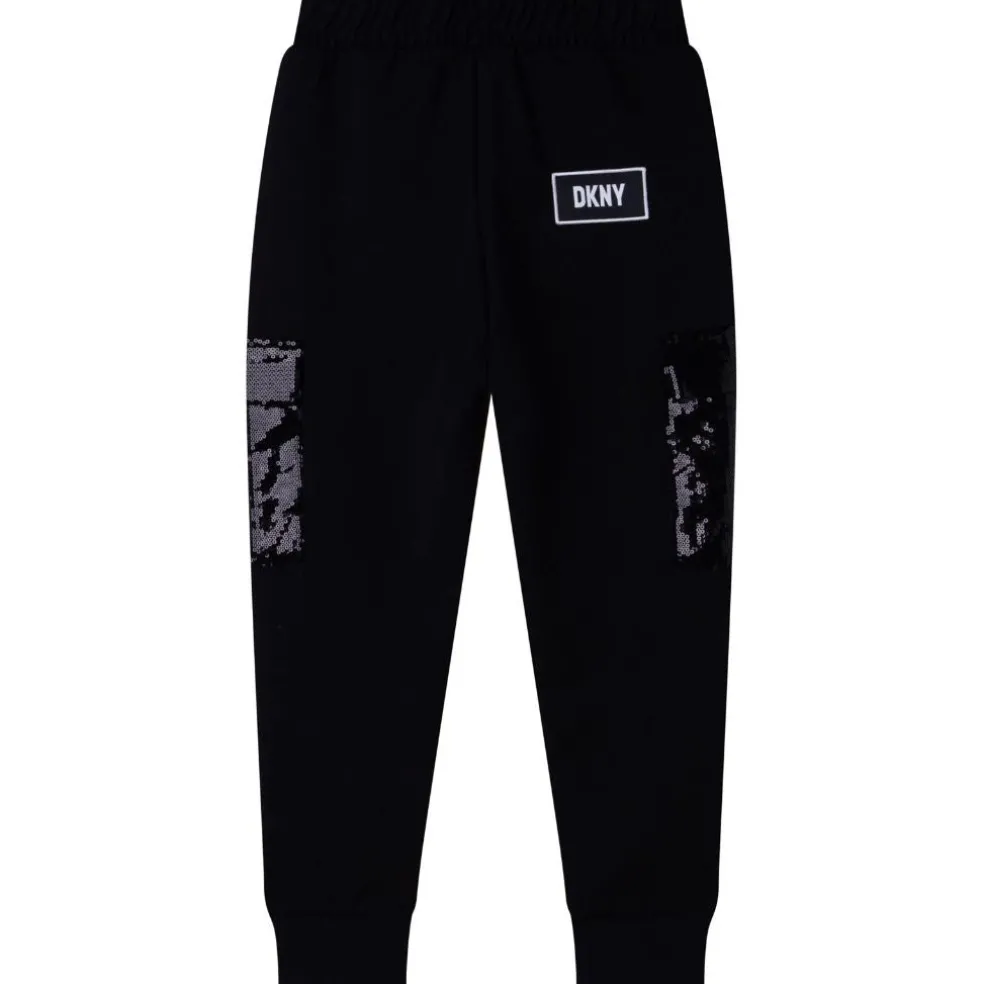 Milano pants, with 2 front pockets + sequins flap pockets on sides. Elasticated waist with DKNY plastic buckle.