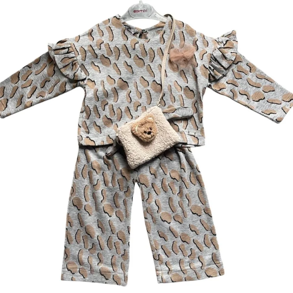 Matching wide leg trousers have an elasticated waistband and a cute teddy bear bag completes the outfit.