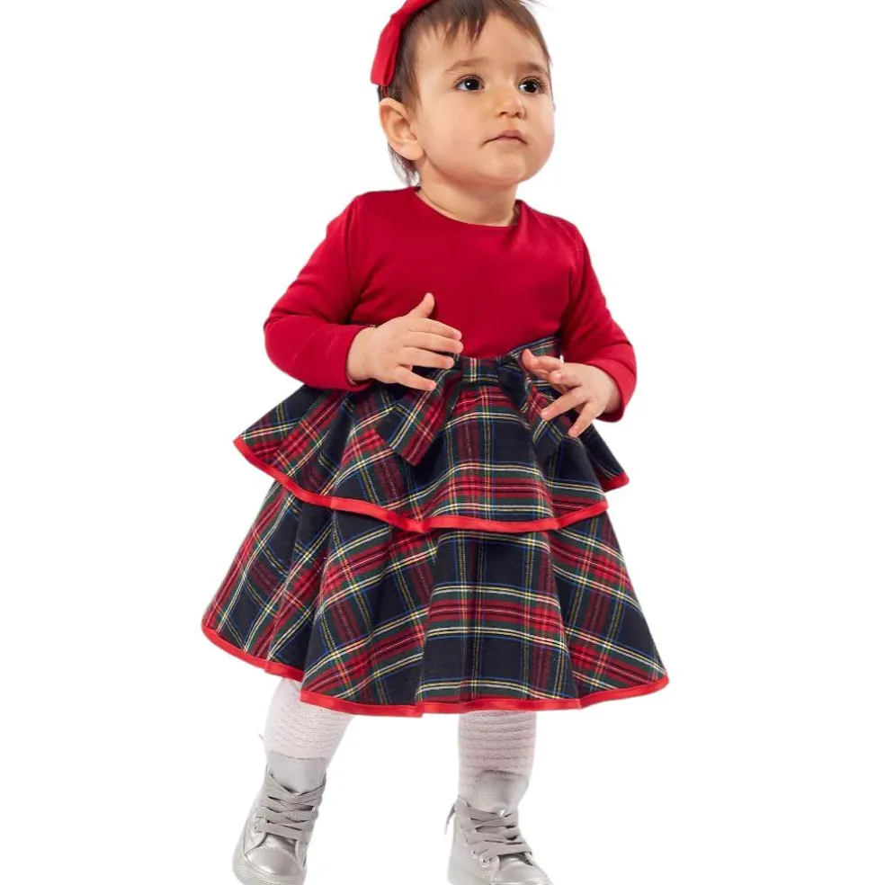 Fully lined long sleeved dress with a round neckline and a 2 tiered ruffle tartan skirt and an appliquéd bow on the front.