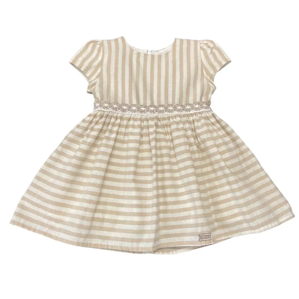 Fully lined beige striped dress which has a silver metallic thread running through it. The dress has a round neckline and back zip fastening.