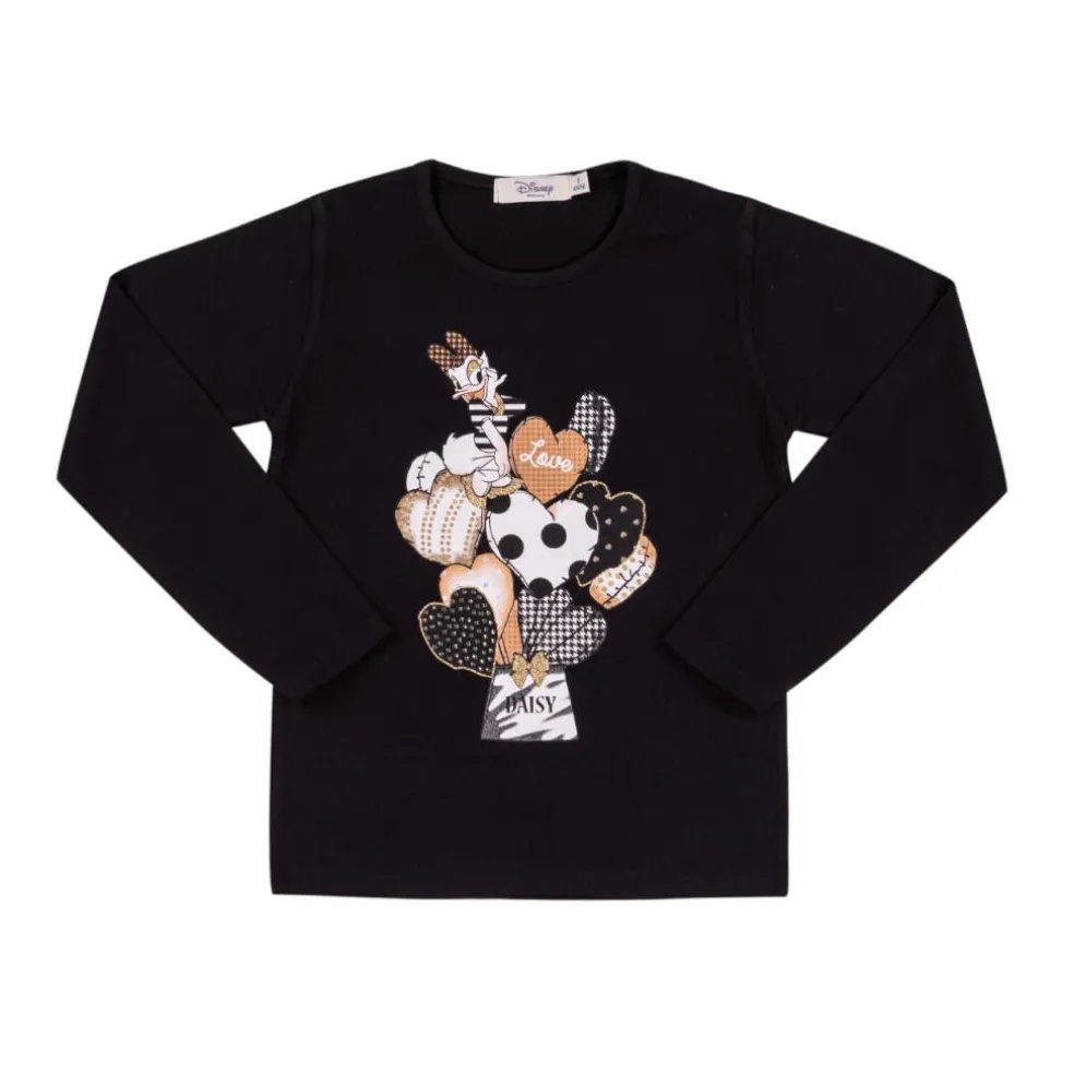 Long sleeved t shirt with a round neckline and the iconic Disney Daisy Duck printed motif on the front which is finished with gold glitter and diamantés.