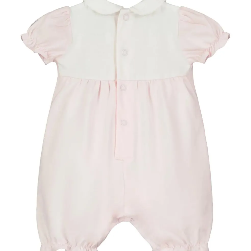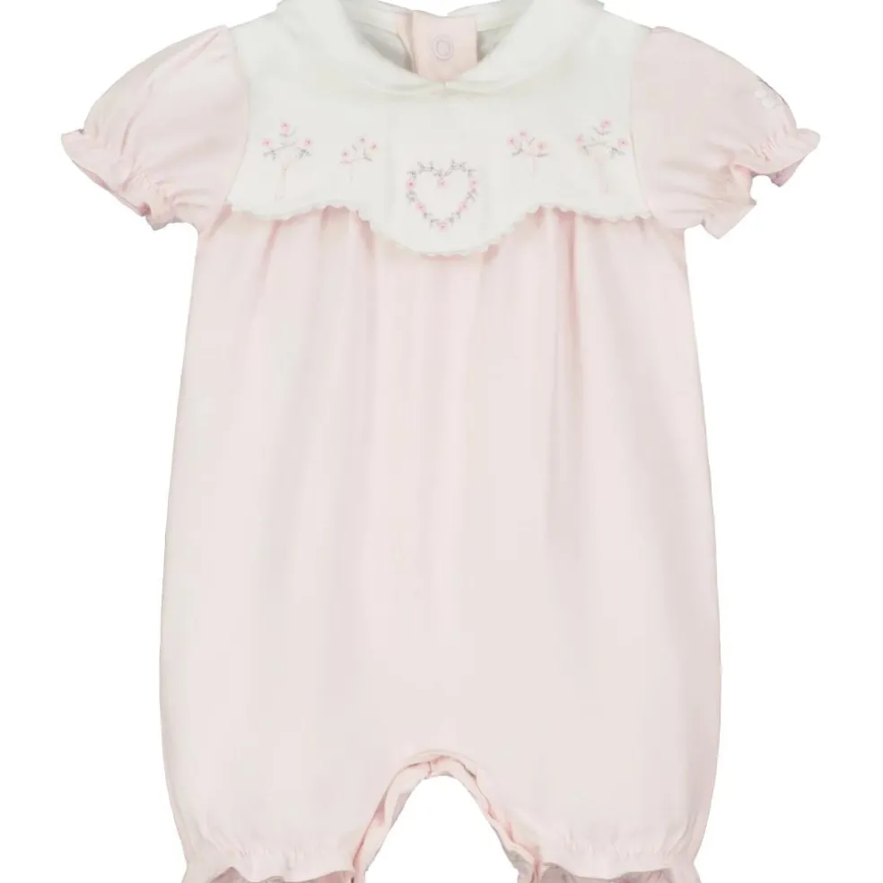 The top part of the romper has a white curved over-yoke edged with ric-rac. Beautiful floral heart and spray embroidery in shades of pink and grey, sits along the curved edge, below a rounded white collar. Little gathered sleeves and legs ensure a comfy fit for baby.